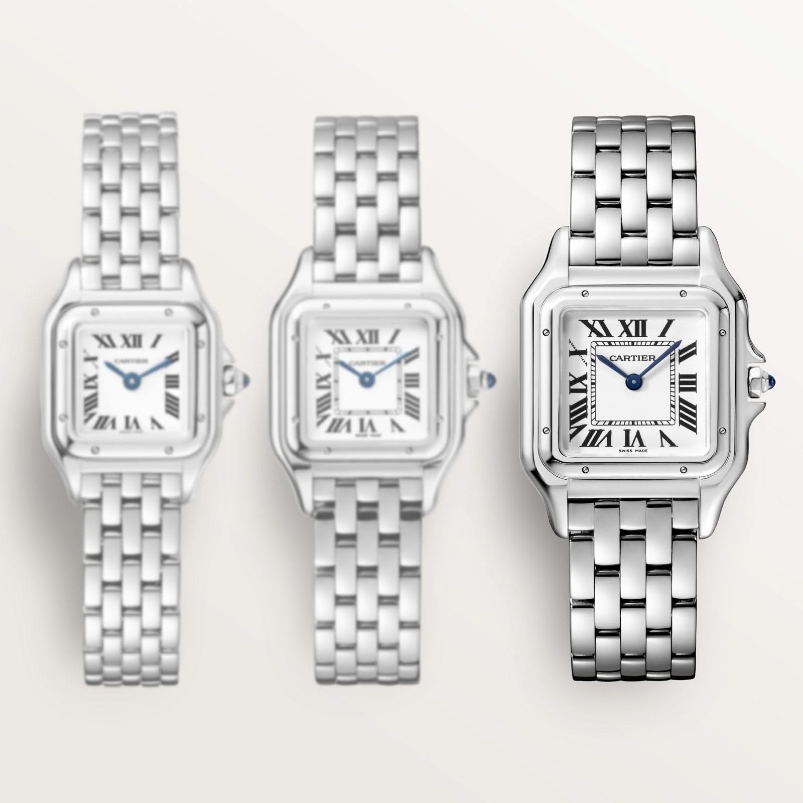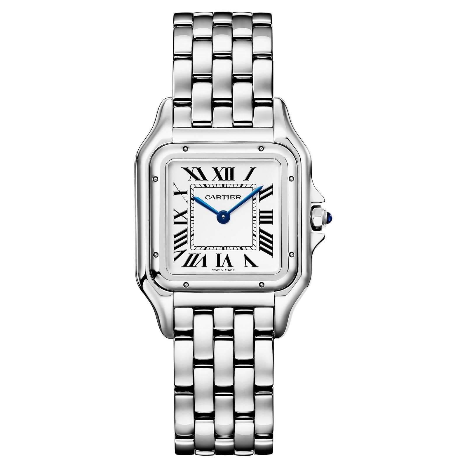 Stainless steel Cartier Panthère medium quartz watch featuring a silver Roman dial with a stainless steel bezel and case. The watch case is 27mm x 37mm and is attached to a stainless steel bracelet.