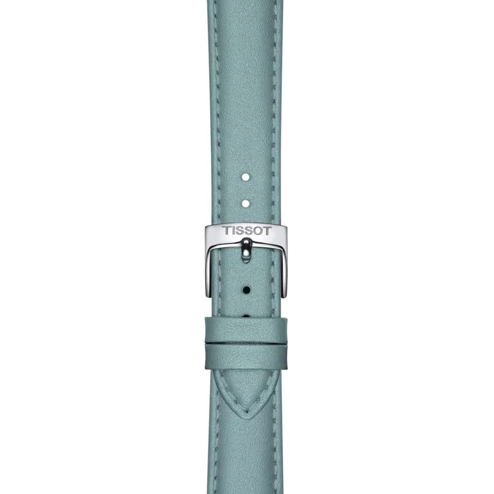 Stainless steel Tissot Carson Premium Lady Moonphase quartz watch featuring a light blue Roman moonphase date dial with a stainless steel bezel. The watch case is 32mm and is attached to a light blue strap.