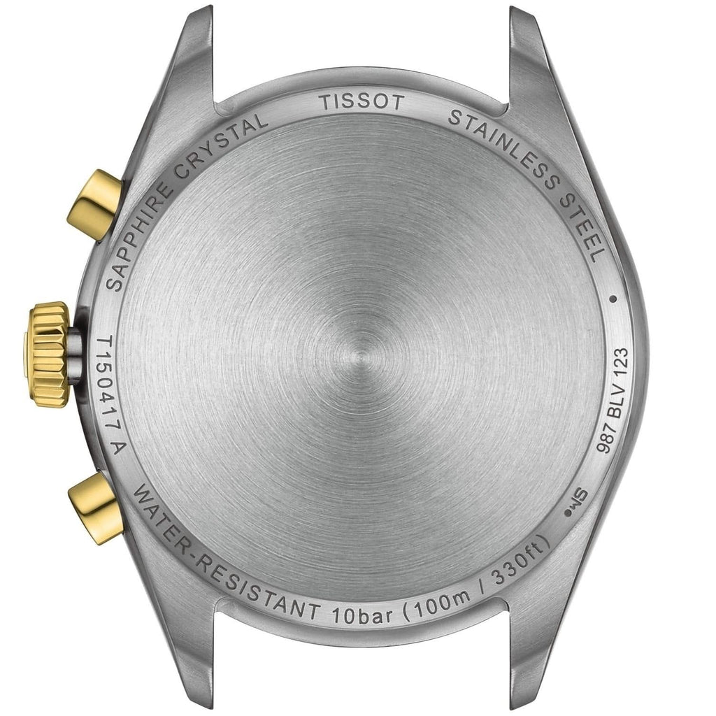 Stainless steel and yellow gold PVD Tissot PR100 chronograph quartz watch featuring a silver index date dial with a yellow gold PVD bezel and a stainless steel case. The watch case is 40mm and is attached to a stainless steel and yellow gold PVD bracelet.