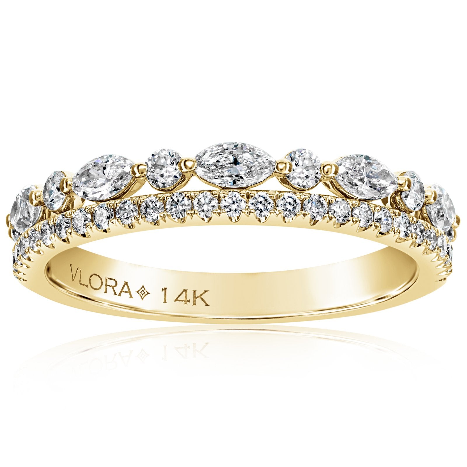 14K yellow gold diamond wedding band from the Reis-Nichols Collection. The band features five marquise, and 33 round brilliant cut diamonds weighing approximately 2/3ctw. Size 6.5 in stock now. Please call or email for details on special order sizes and availability.