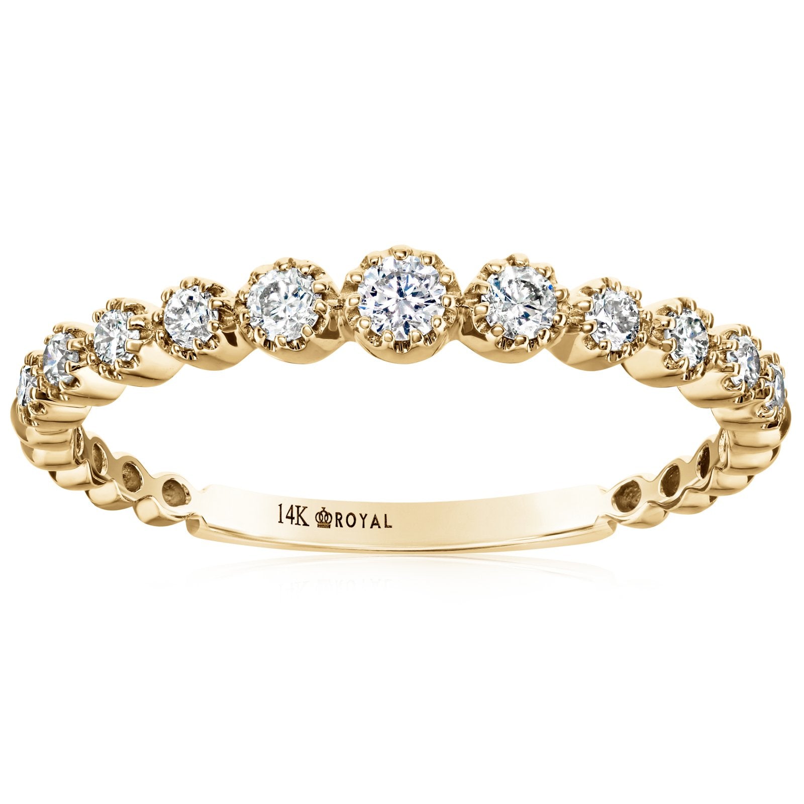 14K yellow gold diamond band from the Reis-Nichols Collection. The band features 11 round brilliant cut diamonds weighing .33 ctw. Special order sizes available. Inquire for pricing.