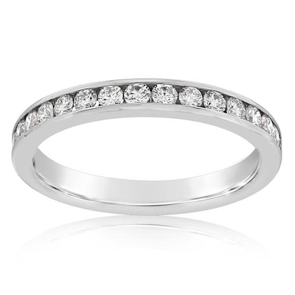 18K white gold diamond wedding band from the Reis-Nichols Collection. The band features 17 round brilliant cut diamonds weighing .47 ctw. Size 6 in stock now. Special order sizes also available. Pricing may vary with size of ring.