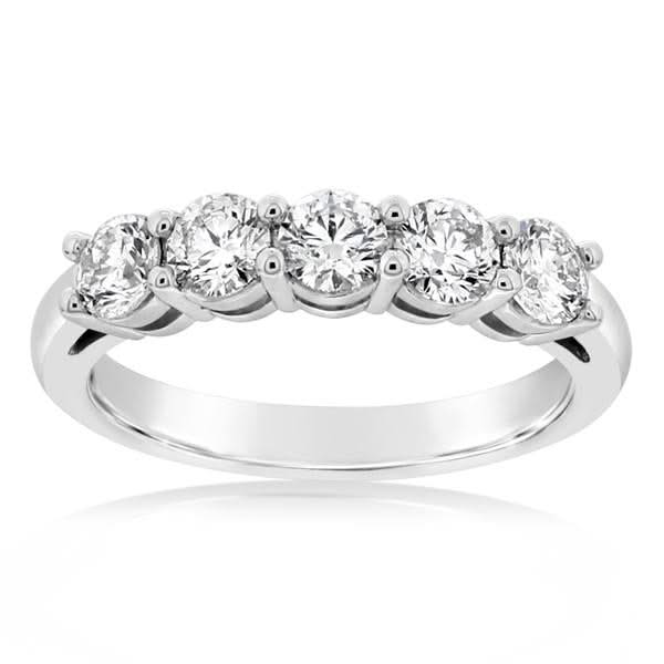 Platinum diamond wedding band from the Reis-Nichols Collection. The band features five round brilliant cut diamonds weighing 1.00 ctw. Size 6.5 in stock now. Special order sizes available. Pricing may vary with size of ring.