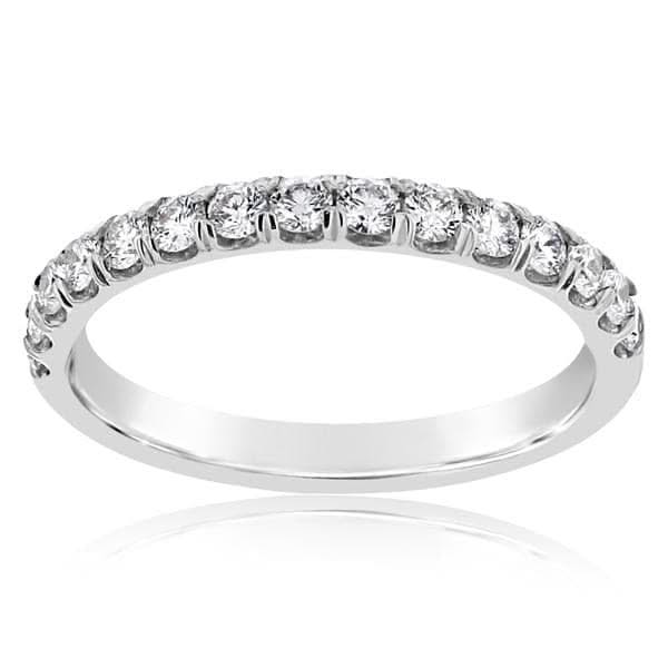 Platinum diamond wedding band from the Reis-Nichols Collection. The band features 15 round brilliant cut diamonds weighing .50 ctw. Size 4 in stock now. Special order sizes also available. Pricing may vary with size of ring.