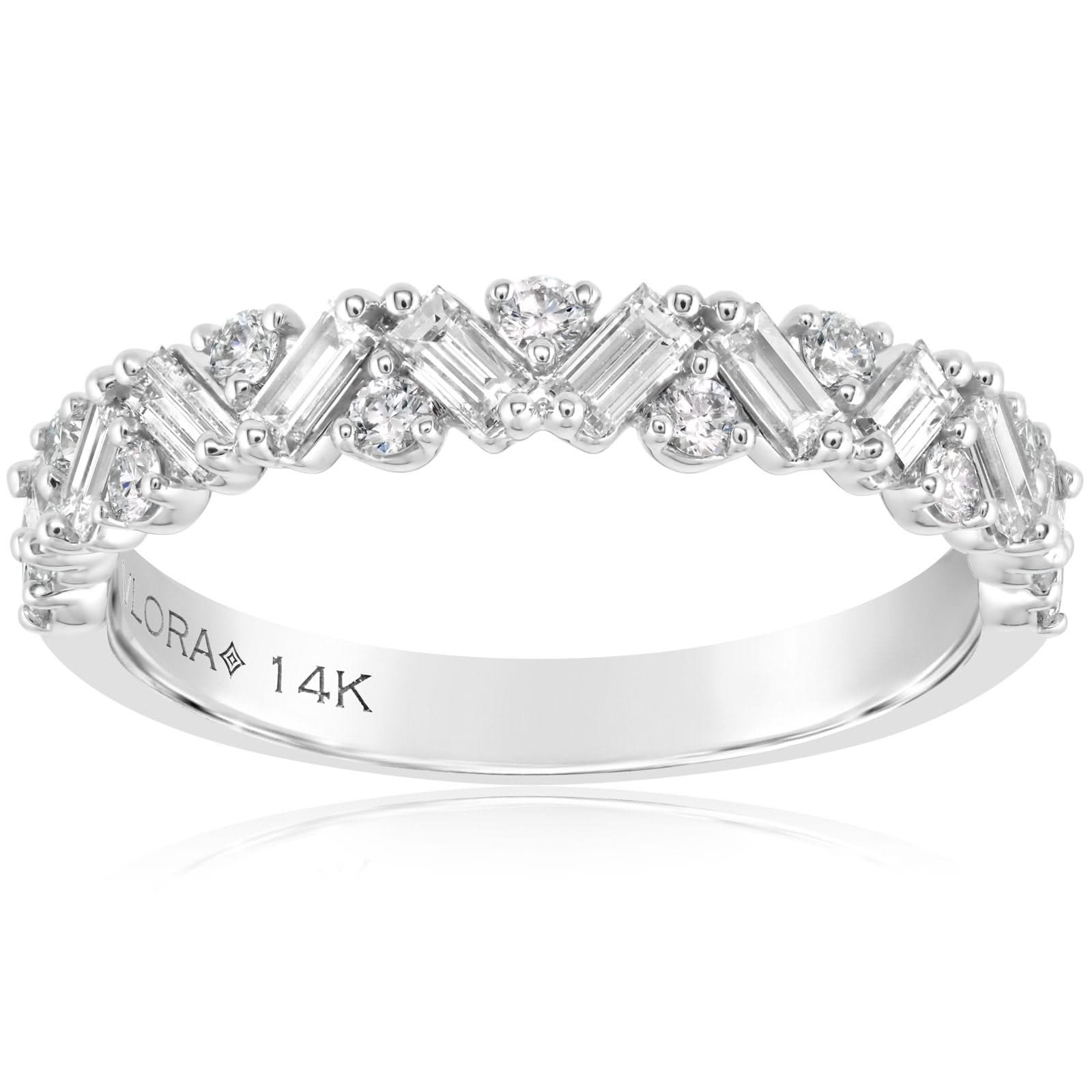 14K white gold diamond wedding band from the Reis-Nichols Collection. The band features ten baguette diamonds, and 11 round brilliant cut diamonds weighing approximately 2/3 ctw. Size 6.5 in stock. Special order sizes available. Pricing may vary with size.