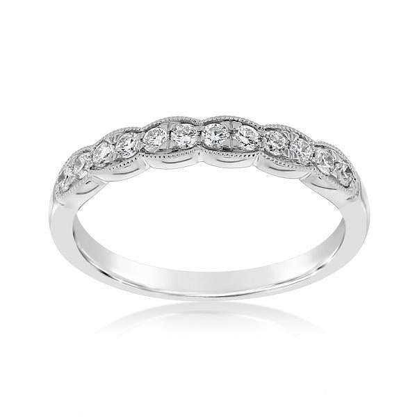 14k white gold scallop edged diamond band from the Reis-Nichols Collection. The band features 12 round brilliant cut diamonds weighing .25 ctw. Size 6.5 in stock now. Special order sizes available. Please call or email for size information and availability.
