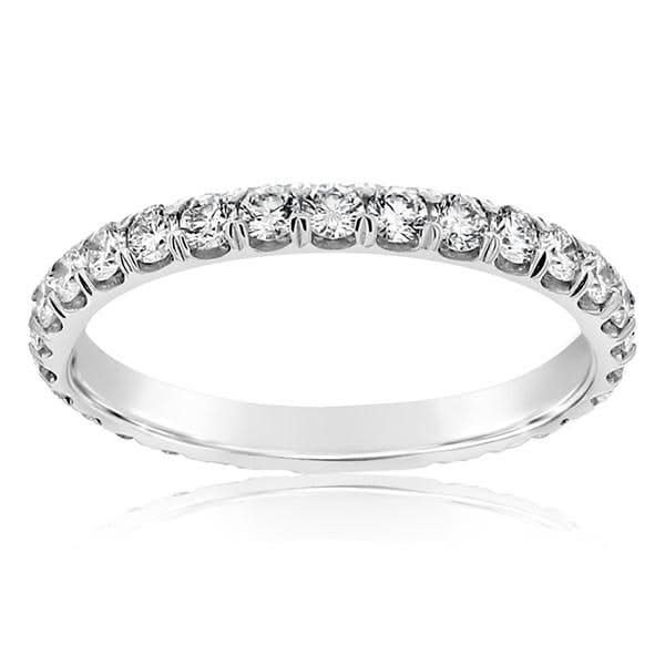 14K white gold diamond eternity band from the Reis-Nichols Collection. The ring features 30 round brilliant cut diamonds weighing 1 ctw. Size 6.5 in stock now. Special order sizes also available. Pricing may vary with size of ring.