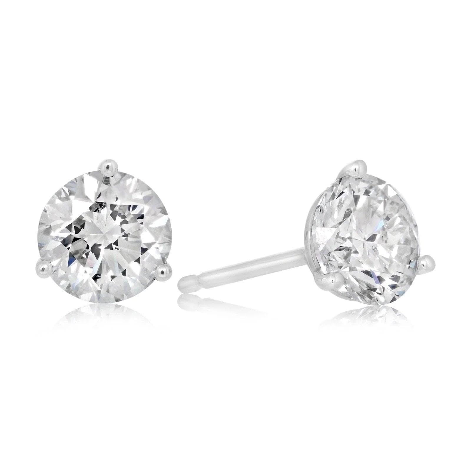14K white gold diamond stud earrings from the Reis-Nichols Collection. The earrings feature two round brilliant cut diamonds weighing 1.50 ctw and are approximately 7.00mm in diameter. The diamonds are three prong martini set.