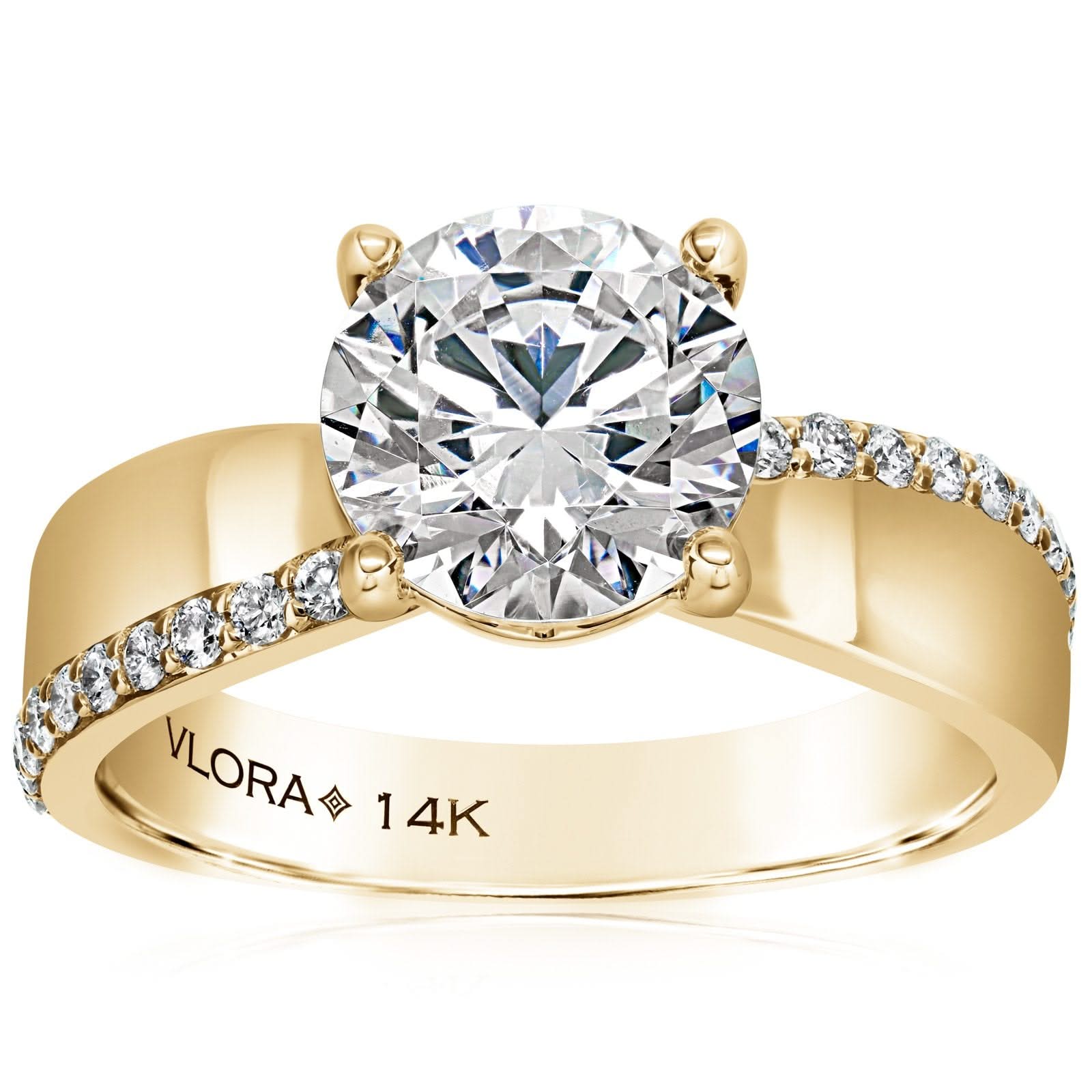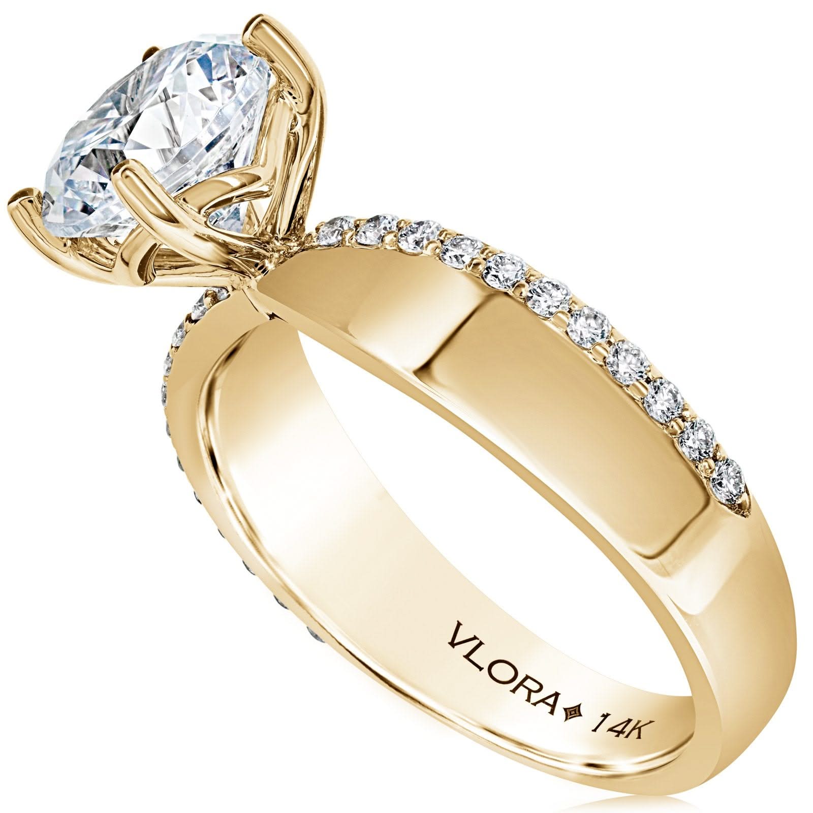 14K yellow gold diamond engagement ring setting from the Reis-Nichols Collection. The ring features 22 round brilliant cut diamonds weighing approximately 1/4ctw. The ring setting is designed to hold a 2ct round center diamond. Center sold separately. Size 6.5 in stock now. Please call or email for details on special order sizes and availability.