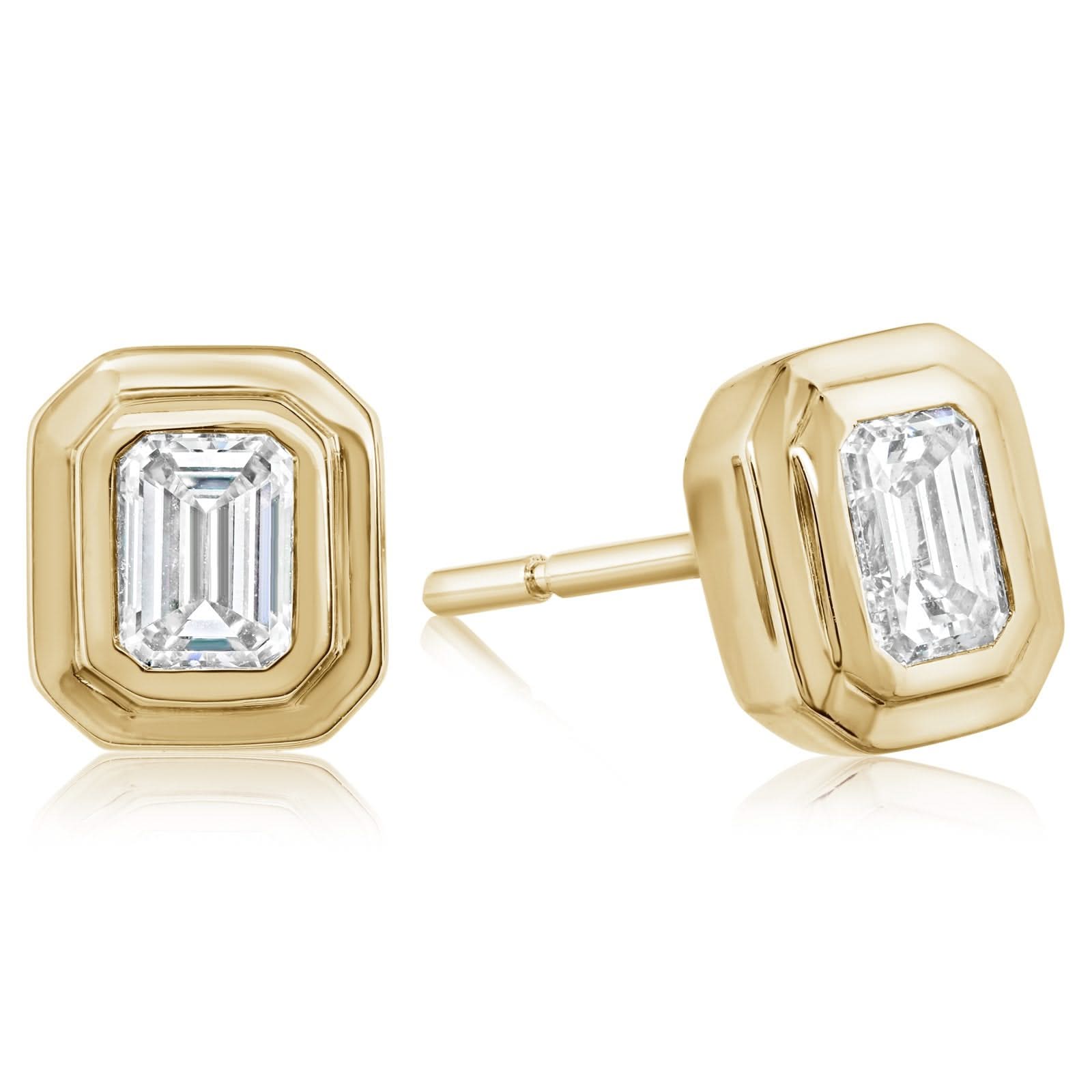 14K Gold Double Bezel Emerald Cut Diamond Stud Earrings