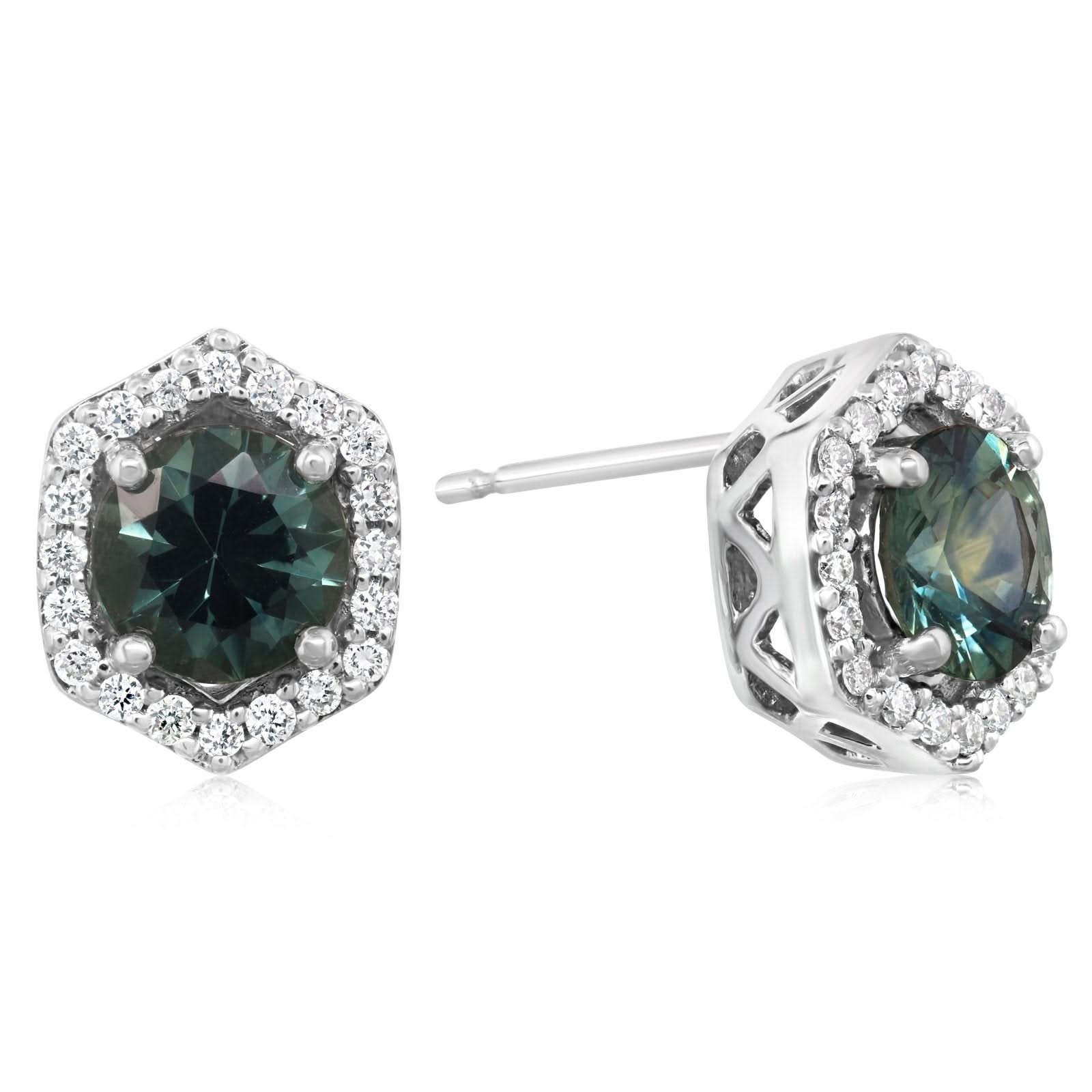 14K Gold Round Montana Sapphire & Diamond Halo Stud Earrings