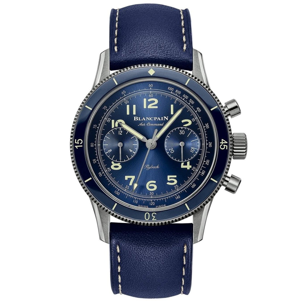 Titanium Blancpain Air Command automatic watch featuring a blue arabic dial with blue subdials and a titanium blue ceramic insert bezel. The watch case is 42.5mm and is attached to a blue calfskin leather strap with a titanium folding clasp. Model number AC02 12B40 63B.