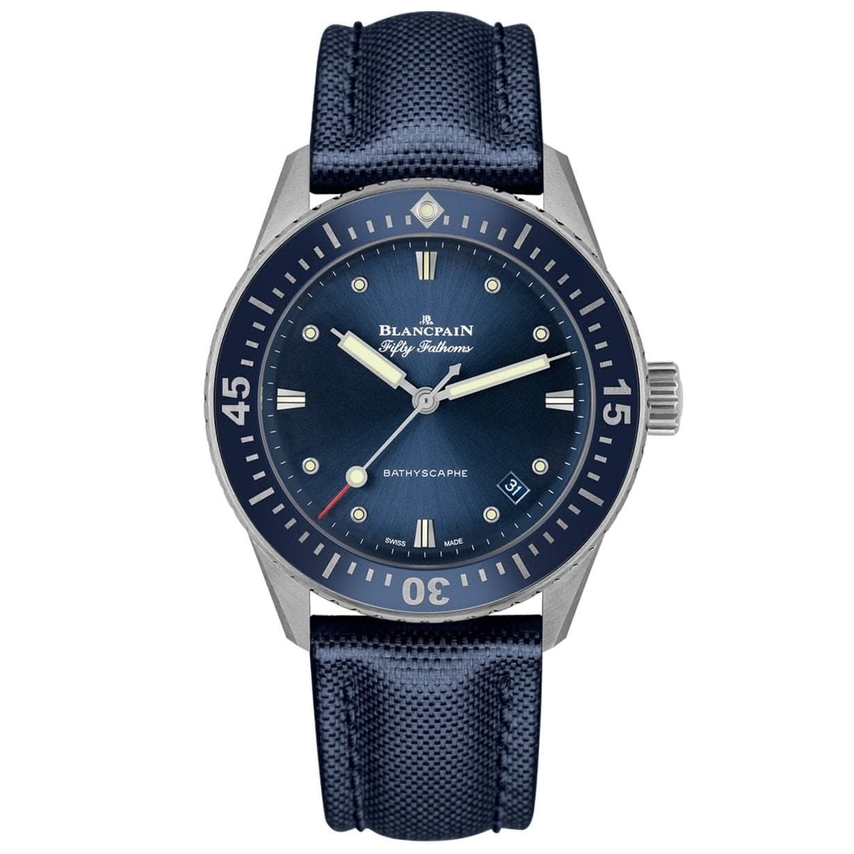 Stainless steel Blancpain Fifty Fathoms Bathyscaphe automatic watch featuring a blue index date dial with a stainless steel blue ceramic insert bezel. The watch case is 38mm and is attached to a blue canvas strap. Model number 5100 1140 O52A.