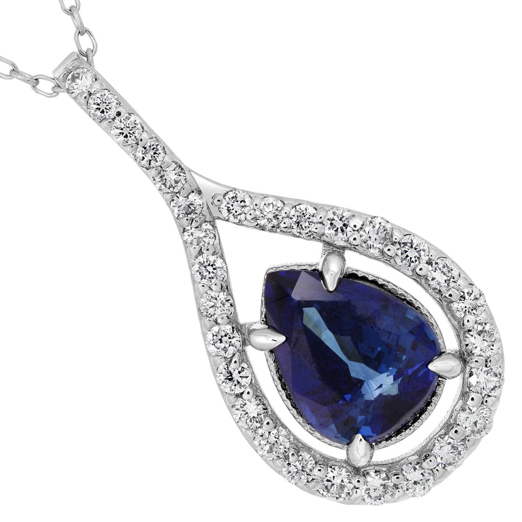 18K white gold blue sapphire and diamond necklace from the Reis-Nichols Collection. The necklace features one pear shape blue sapphire weighing 1.50 ctw and 29 brilliant round diamonds weighing .27 ctw. The necklace measures 18'' in length.