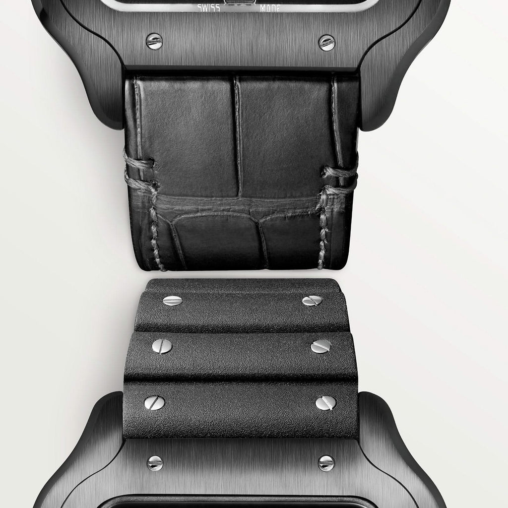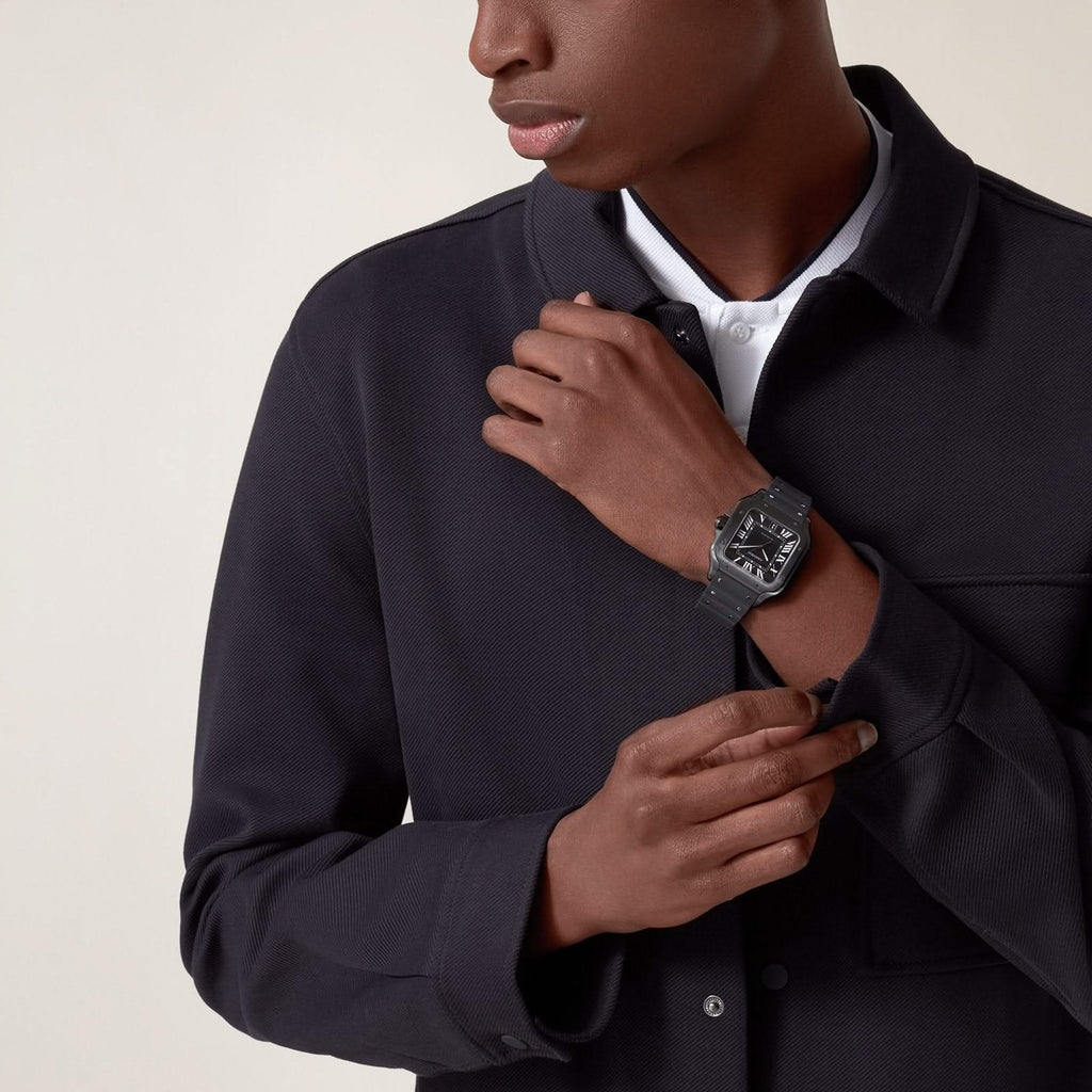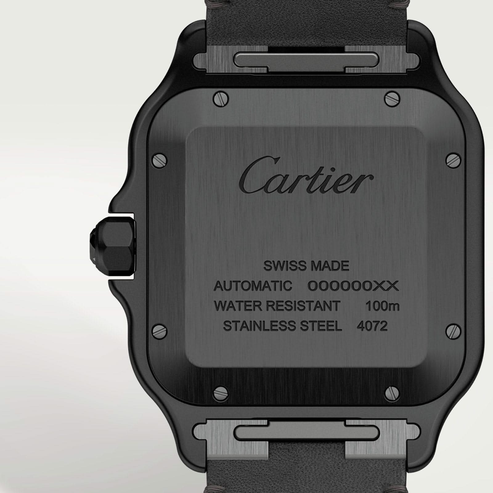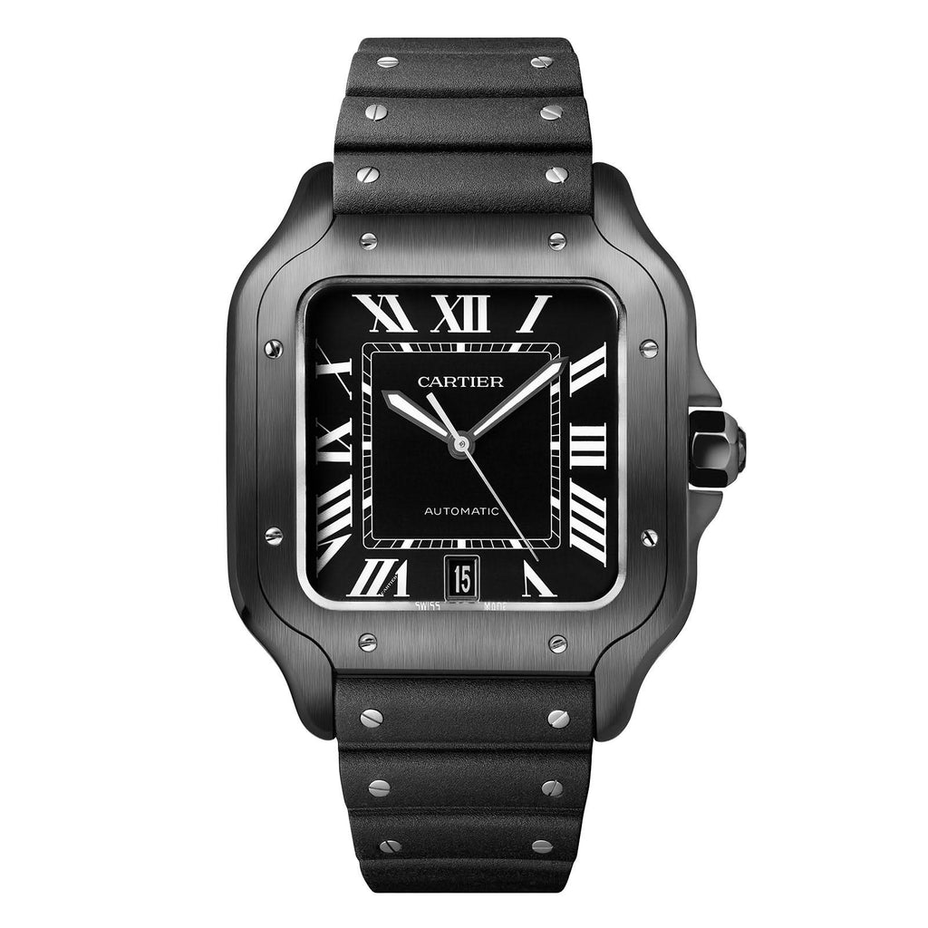 Black stainless steel Cartier Santos automatic watch featuring a black Roman date dial with a black stainless steel bezel and case. The watch case is 47.5mm x 40mm and is attached to a black rubber strap with an additional black alligator strap.