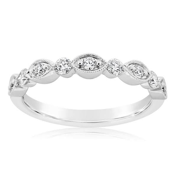 14K white gold diamond band from the Reis-Nichols Collection. The ring features 13 round brilliant cut diamonds weighing .50 ctw. Special order sizes available. Pricing may vary with size of ring.