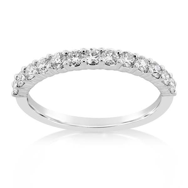 14K white gold diamond band from the Reis-Nichols Collection. The ring features 15 round brilliant cut diamonds weighing .25 ctw. Special order sizes available. Pricing may vary with size of ring.