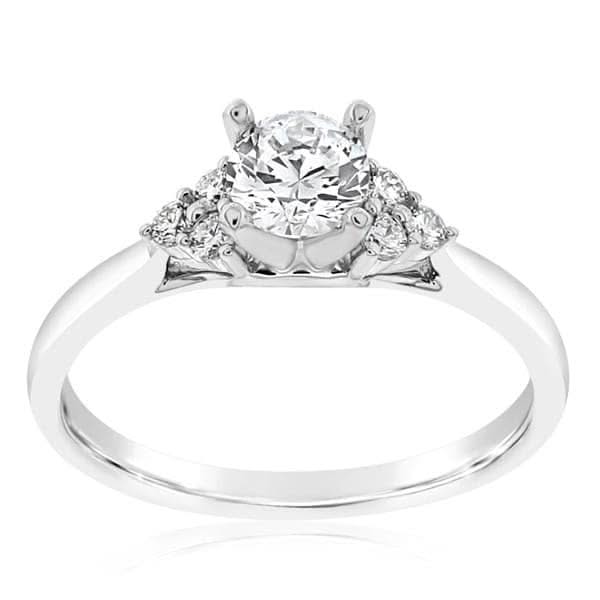 14K white gold diamond engagement ring setting from the Reis-Nichols Collection. The ring features six round brilliant cut diamonds weighing approximately 1/5 ctw. The ring is designed to hold a round center diamond. Center diamond sold separately.