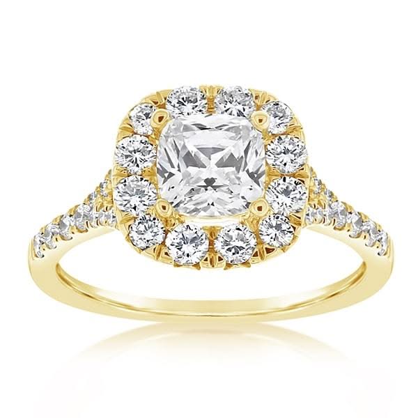14K yellow gold diamond engagement ring setting from the Reis-Nichols Collection. The ring features 36 round brilliant cut diamonds weighing .65 ctw and is designed to hold a 1 ct cushion cut center diamond. Center diamond sold separately. Size 6.5 in stock now. Special order sizes also available. Please call or email for size information and availability.