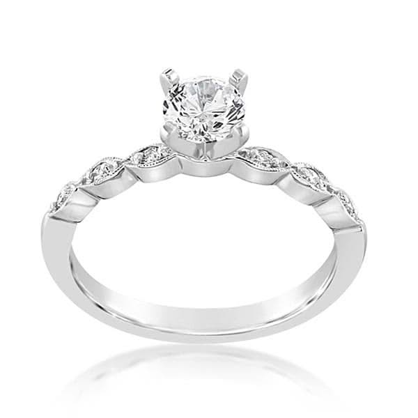 14K white gold diamond engagement ring setting from the Reis-Nichols Collection. The ring features six round brilliant cut diamonds weighing nearly 1/3 ctw. The ring is designed to hold a 1/2 ct center diamond. Center diamond sold separately. Size 7 in stock now. Special order sizes available. Pricing may vary with size.