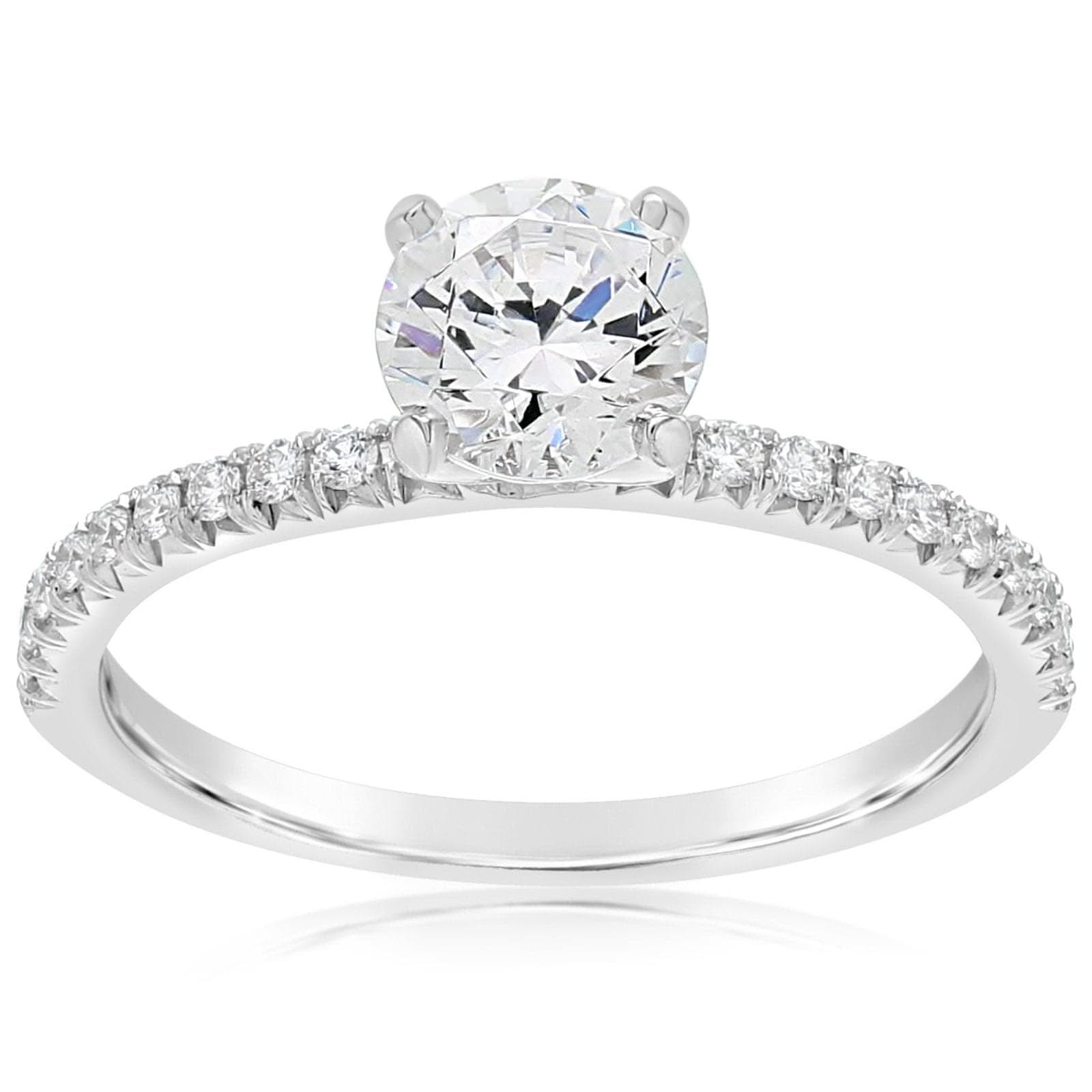 14K white gold diamond engagement ring from the Reis-Nichols Collection. The band features 20 round brilliant cut diamonds weighing 1/5 ctw. The ring is designed to hold .75ct round center diamond. Center diamond sold separately. Size 6.5 in stock now. Special order sizes also available. Pricing may vary with size of ring.