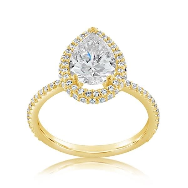 14K yellow gold diamond engagement ring setting designed and created by Reis-Nichols Jewelers. The ring features 86 round brilliant cut diamonds weighing approximately 1/2 ctw. The ring is designed to hold a 1 3/4ct pear-shaped diamond. Center diamond sold separately. Please call or email for size information and availability.