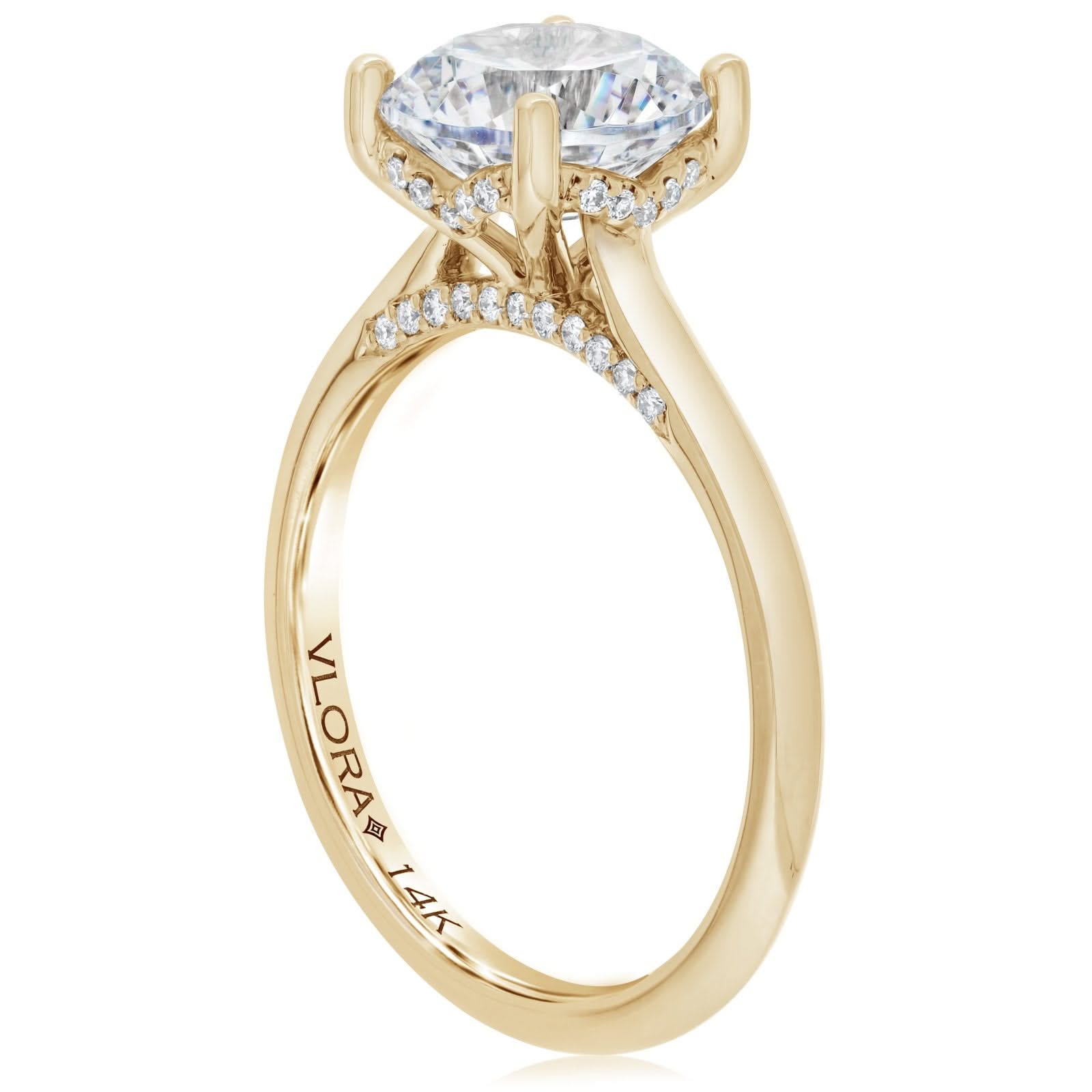 14K yellow gold diamond engagement ring setting from the Reis-Nichols Collection. The ring setting features 42 round brilliant cut diamonds weighing approximately 1/3 ctw. The ring setting is designed to hold a 1.50ct round center diamond. Center sold separately. Size 6.5 in stock now. Special order sizes available. Pricing may vary with size.