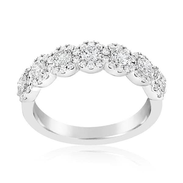 14K white gold diamond halo wedding band from the Reis-Nichols Collection. The band features 65 round brilliant cut diamonds weighing 1.00 ctw set in seven halos. Size 7 in stock now. Special order sizes also available.