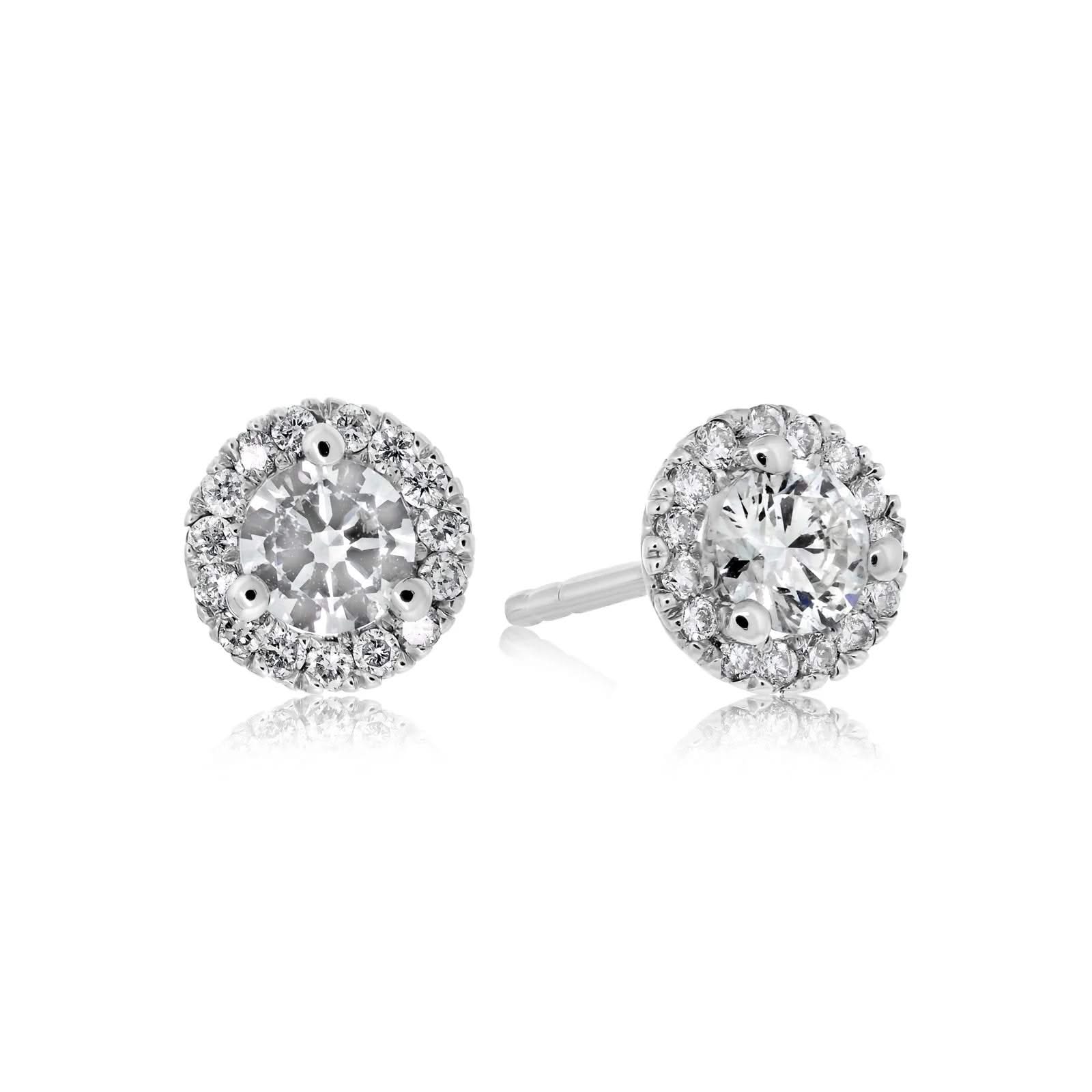 14K white gold diamond margarita halo stud earrings from the Reis-Nichols Collection. The earrings feature 18 round brilliant cut diamonds weighing approximately 1/4 ctw (.23-.27) and are approximately 5.3mm in diameter.