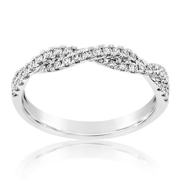 14K white gold diamond twisted wedding band from the Reis-Nichols Collection. The band features 37 round brilliant cut diamonds weighing .30 ctw. Size 6.5 in stock now. Special order sizes also available. Pricing may vary with size of ring.