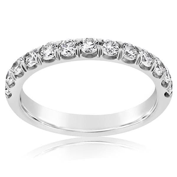 Platinum diamond wedding band from the Reis-Nichols Collection. The band features 13 round brilliant cut diamonds weighing .75 ctw. Size 6.5 in stock now. Special order sizes also available. Pricing may vary with size of ring.