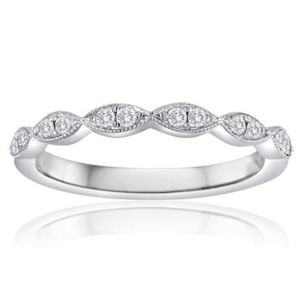 14K white gold diamond wedding band featuring 12 round brilliant cut diamonds weighing nearly 1/10 ctw. Special order sizes also available. Please call or email for size information and availability.