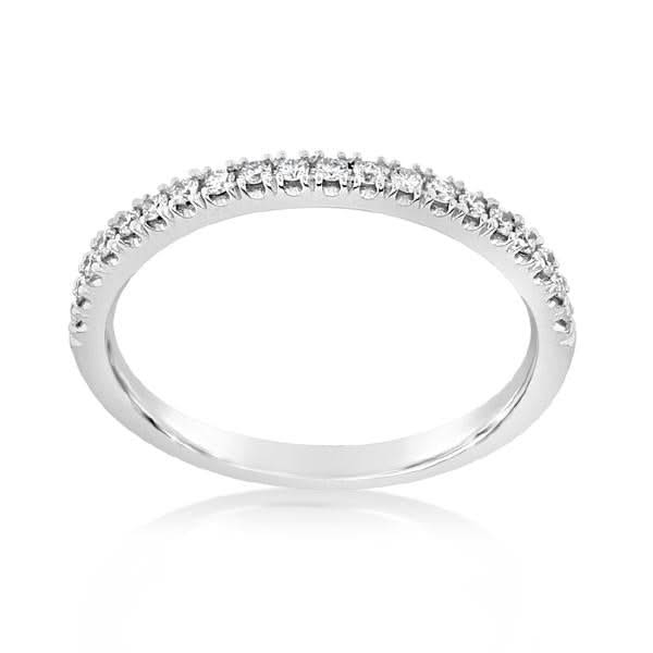 18K white gold diamond band from the Reis-Nichols Collection. The band features nine princess cut diamonds weighing .90 ctw. Size 6.5 in stock now. Special order sizes also available. Pricing may vary with size of ring.