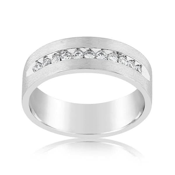 14K white gold comfort fit diamond wedding band from the Reis-Nichols Collection. The band features 11 round brilliant cut diamonds weighing .33 ctw. The band is 7mm wide with a brushed finish. Size 8 in stock now. Please call or email for size information and availability.