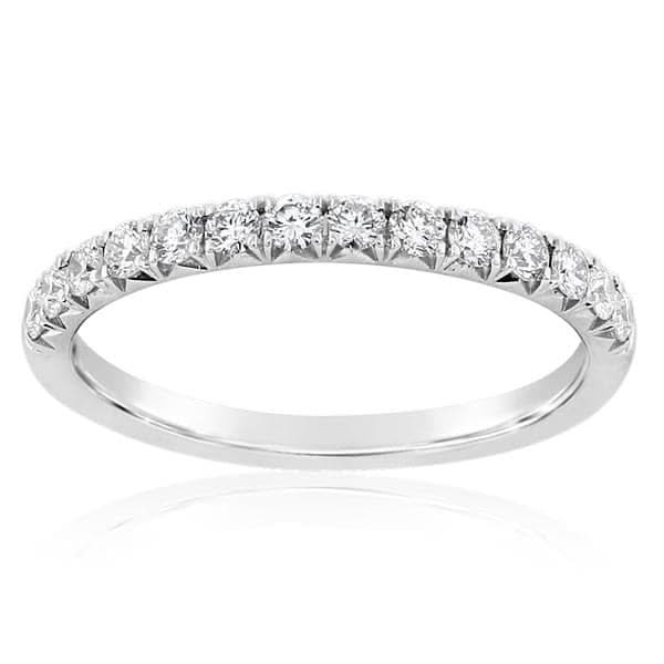14K white gold diamond wedding band from the Reis-Nichols Collection. The band features 14 round brilliant cut diamonds weighing nearly 1/2 ctw. Size 6 in stock now. Special order sizes also available. Pricing may vary with size of ring.