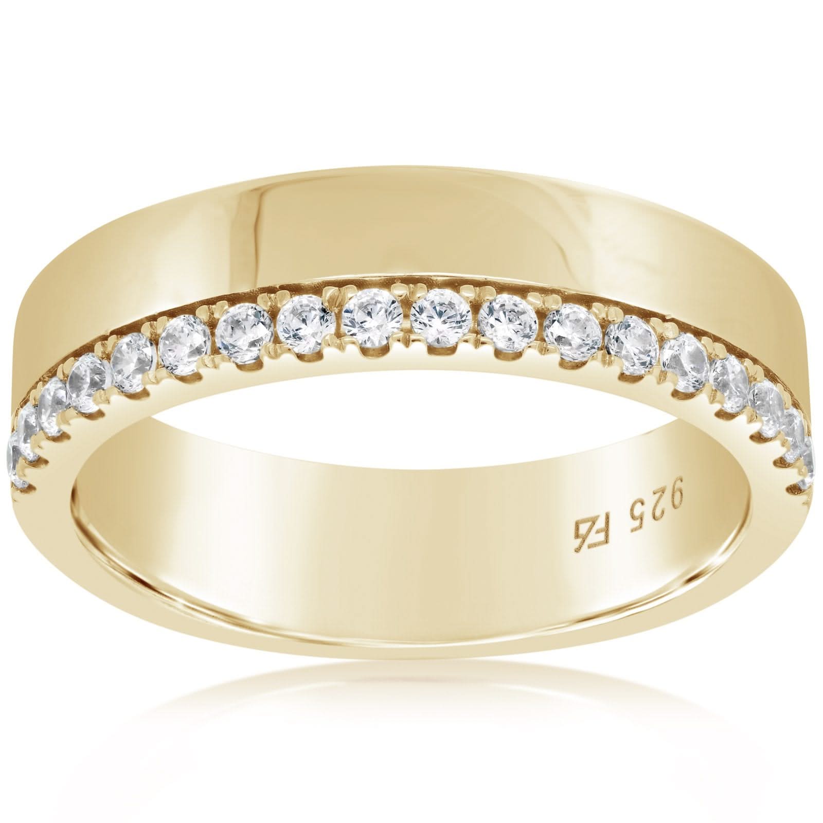 14K yellow gold diamond wedding band from the Reis-Nichols Collection. The band features 18 round brilliant cut diamonds weighing .41 ctw set off center in a line. The band features a polish finish. Special order sizes also available. Pricing may vary with size of ring