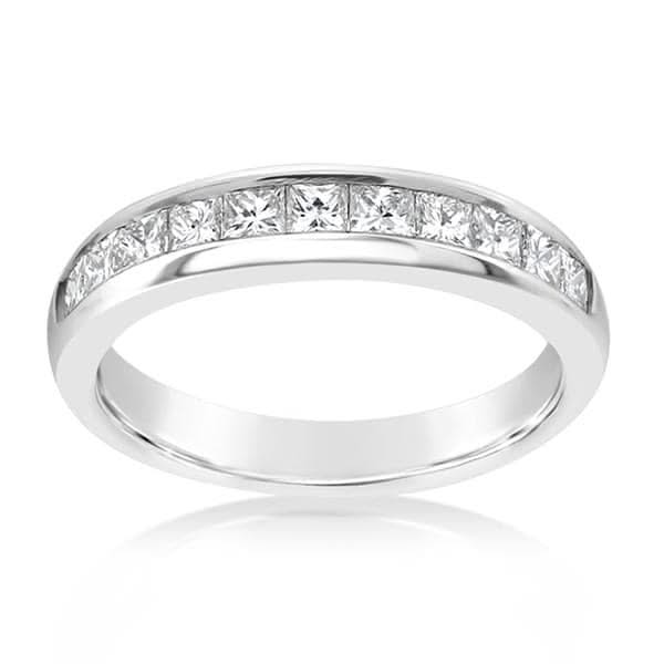 Platinum diamond wedding band from the Reis-Nichols Collection. The ring features 11 princess cut diamonds weighing approximately 3/4 ctw. Size 6.5 in stock now. Special order sizes also available. Pricing may vary with size of ring.