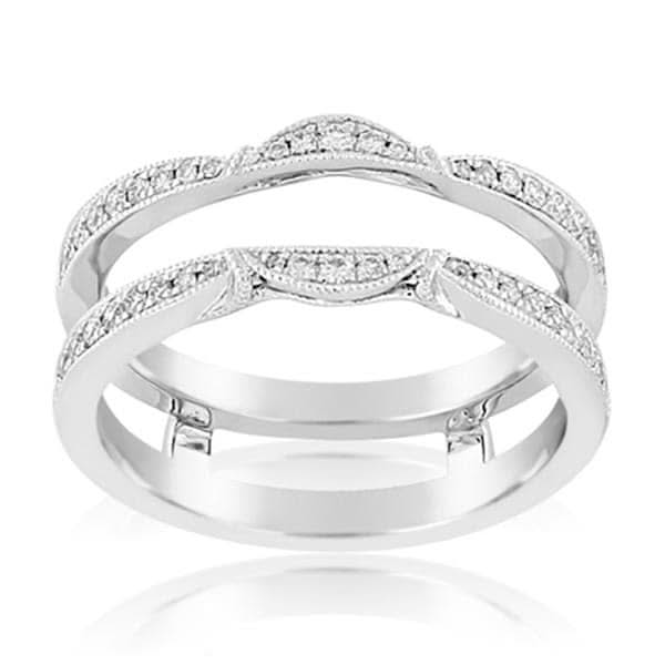 14K white gold diamond wedding jacket from the Reis-Nichols Collection. The ring features 46 round brilliant cut diamonds weighing approximately 1/4 ctw. Size 7 in stock now. Special order sizes also available. Pricing may vary with size of ring.