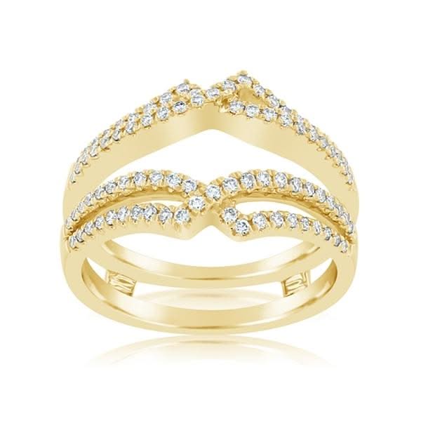 14K yellow gold diamond wedding jacket from the Reis-Nichols collection. The jacket features 88 round brilliant cut diamonds weighing approximately 1/3 ctw (.35-.45). The diamonds are set in a 'V' design above and below the opening in the shank. Size 6 in stock now. Special order sizes also available. Pricing may vary with size of ring.