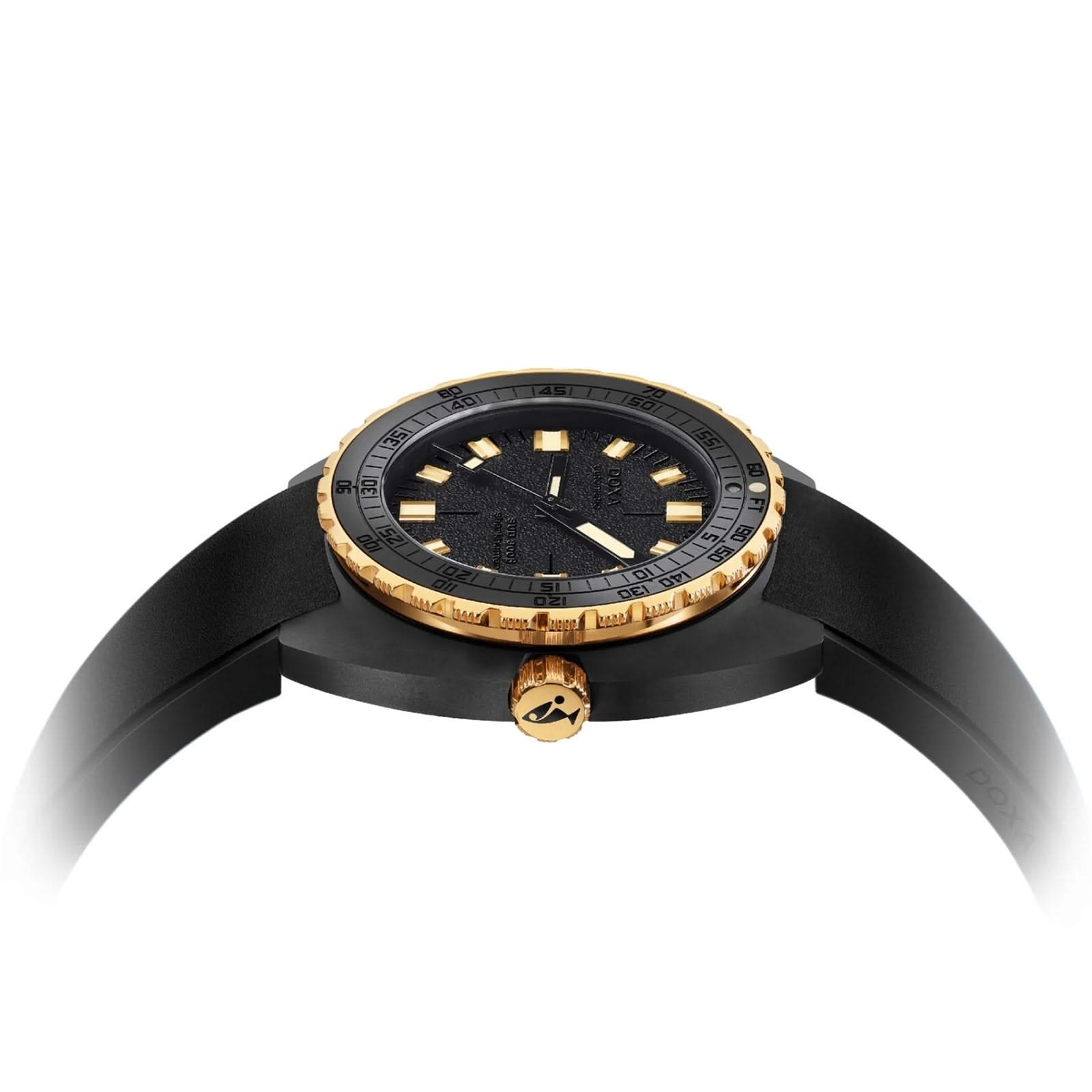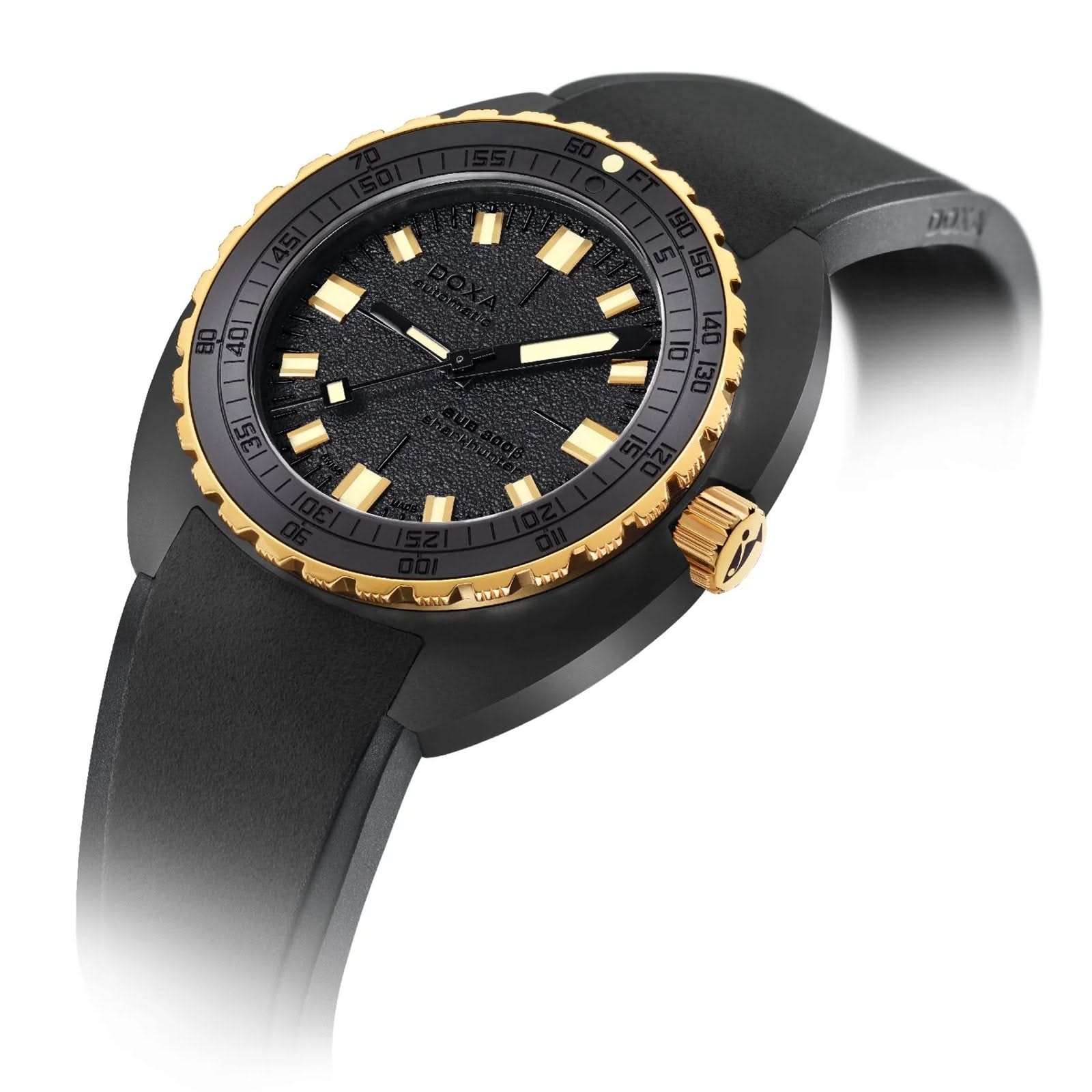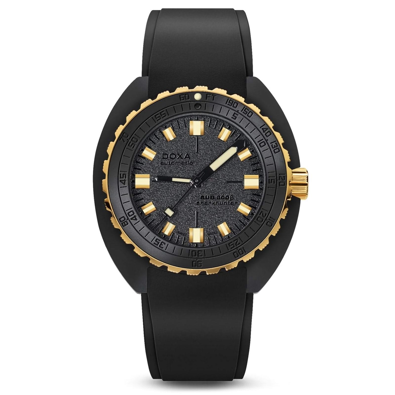 Matte black ceramic DOXA SUB 300 Beta Sharkhunter automatic watch featuring a black grained index dial with an 18K yellow gold black ceramic insert bezel and a matte black ceramic case. The watch case is 42mm and is attached to a black rubber strap. Model number 830.20.101ND.20.