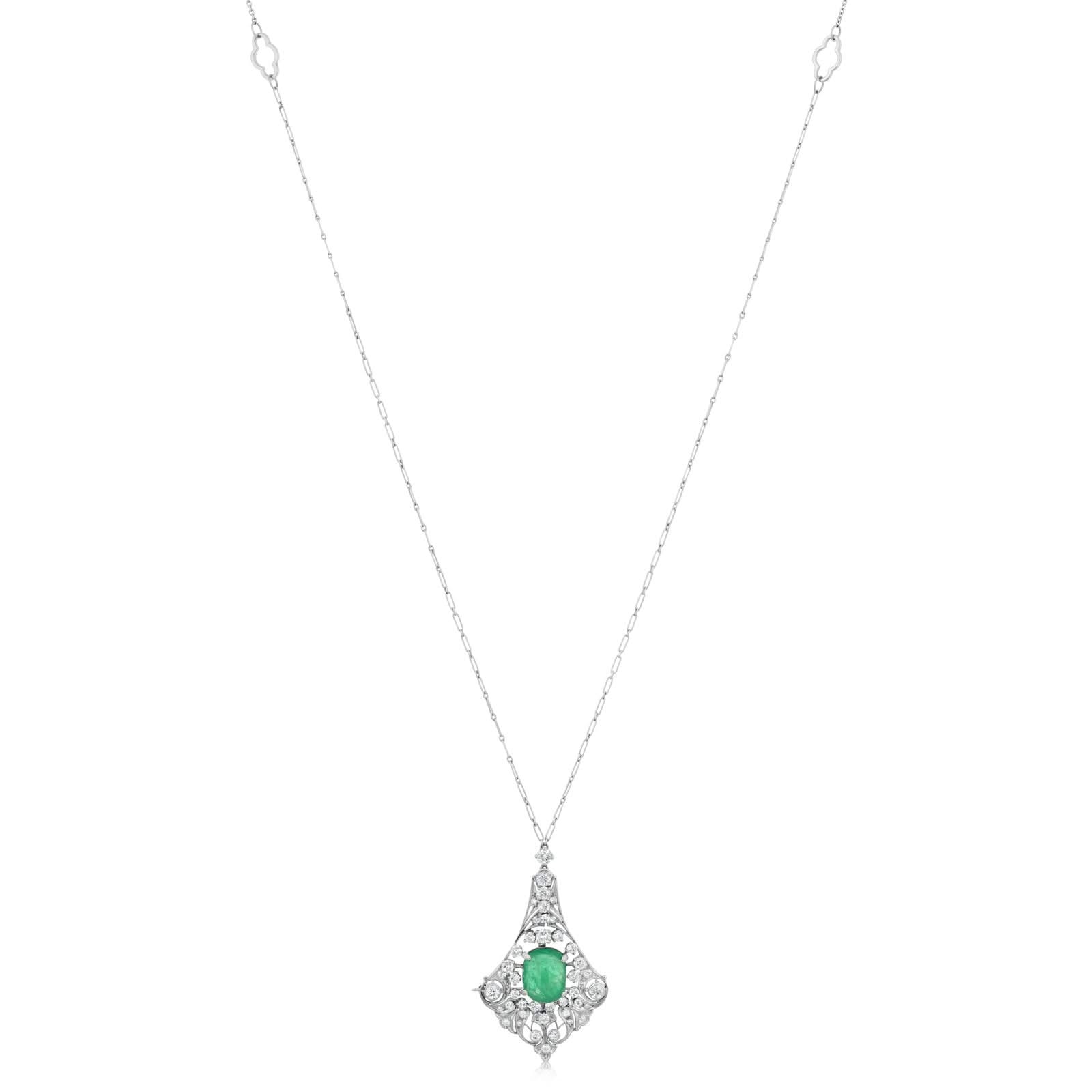 Estate Antique Style Emerald & Diamond Pendant Necklace