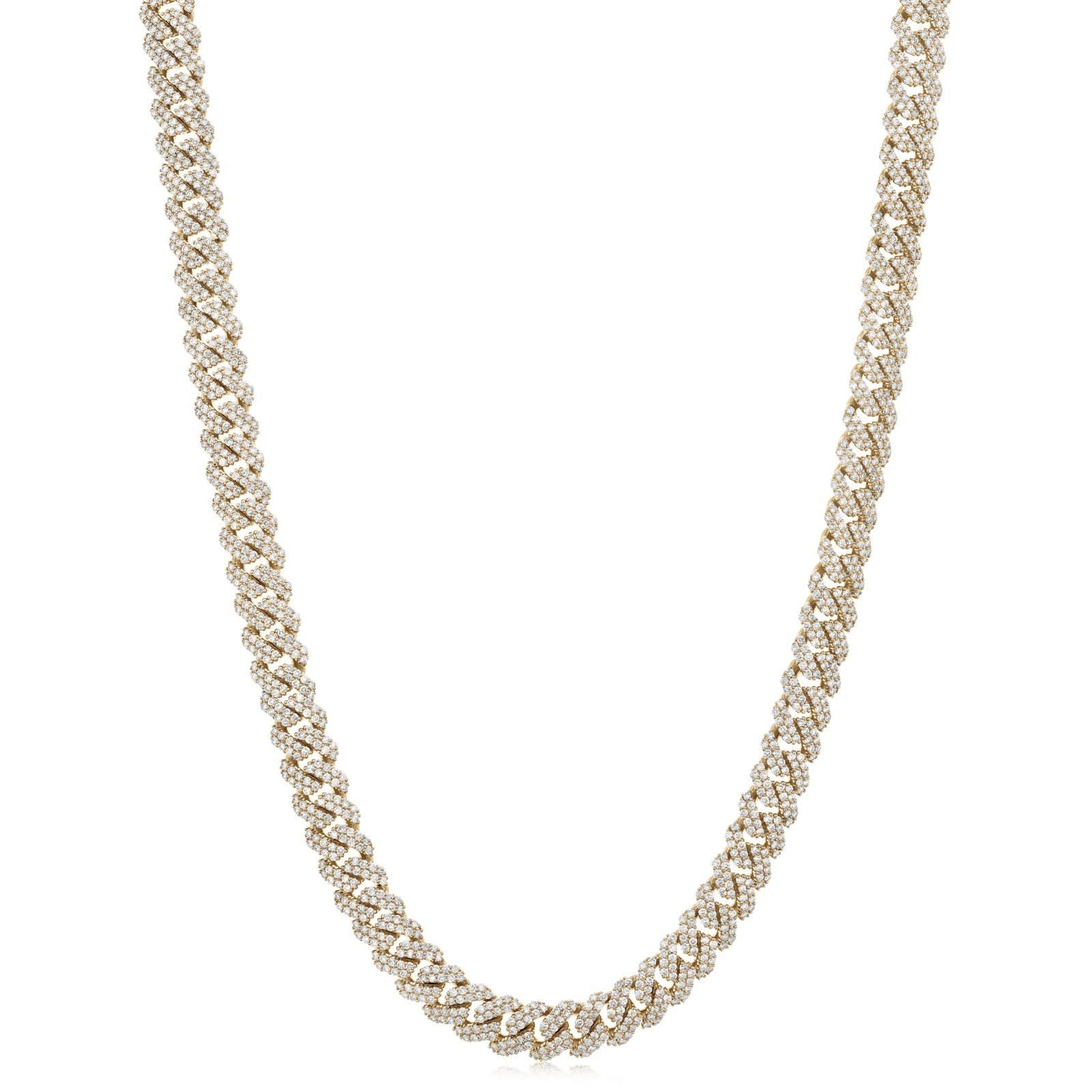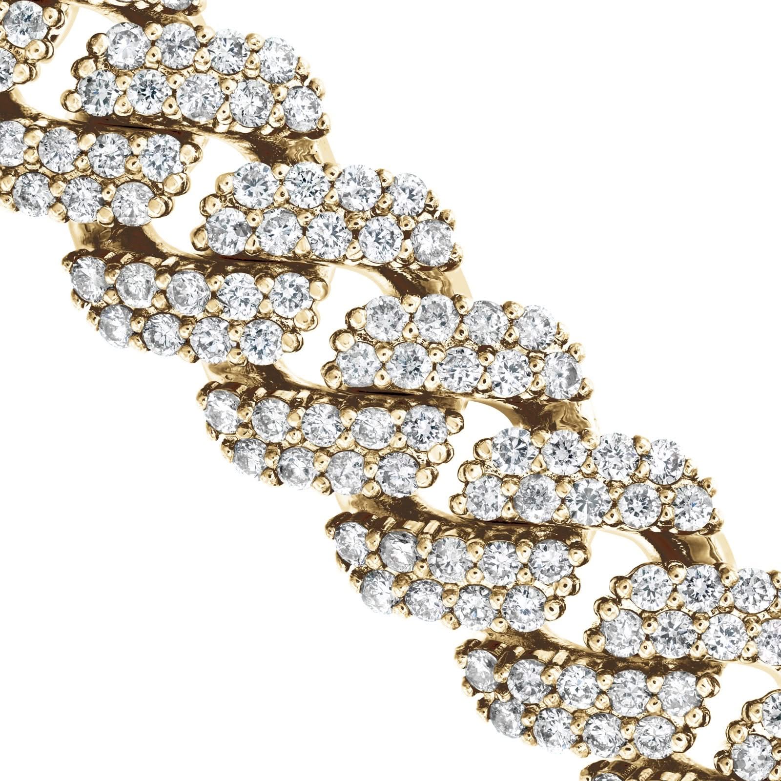 10K yellow gold diamond pave curb link chain necklace. The necklace features 1,935 round brilliant cut diamonds weighing an estimated 19.35 ctw. The chain measures 22" in length and 10mm in width. The necklace features an insert clasp.
