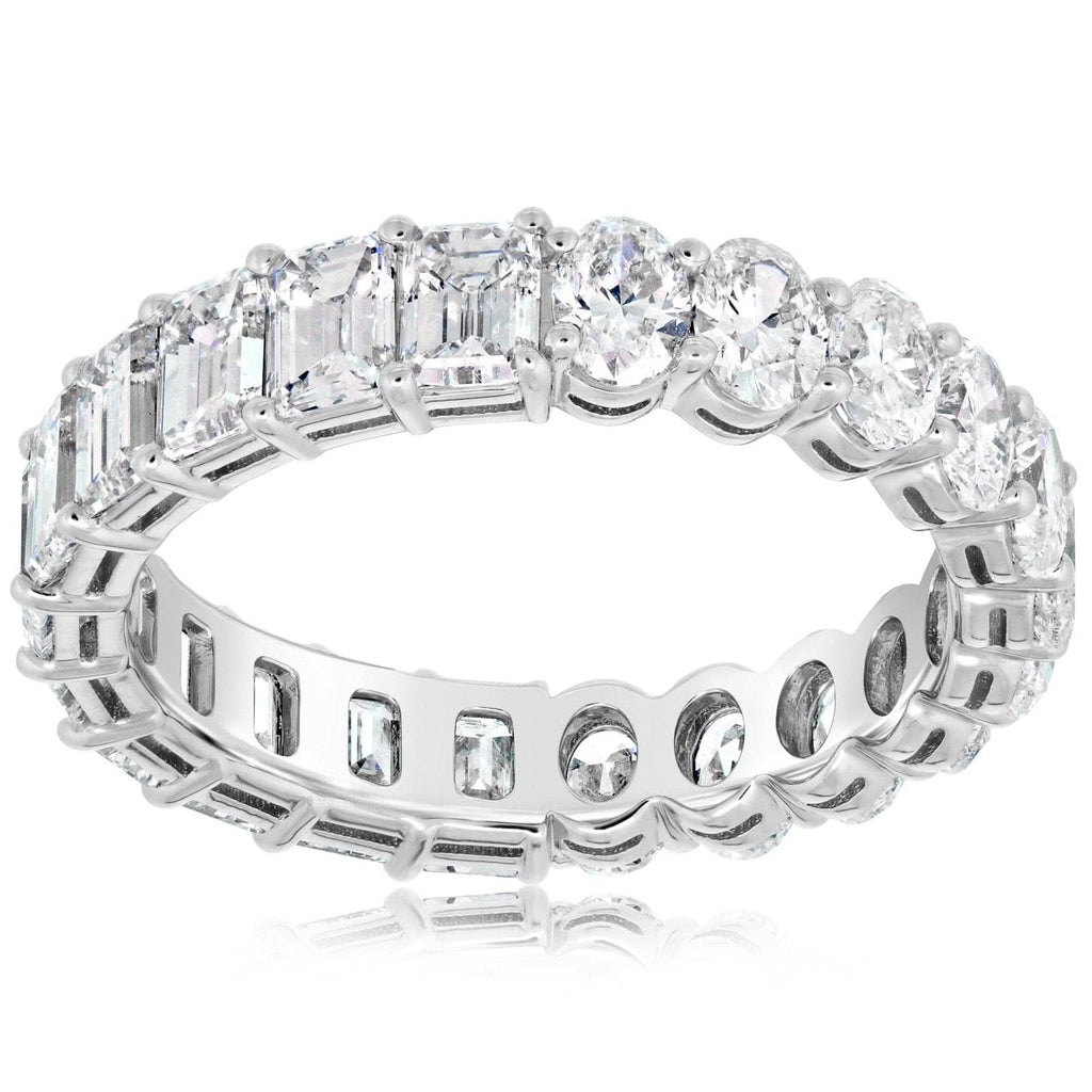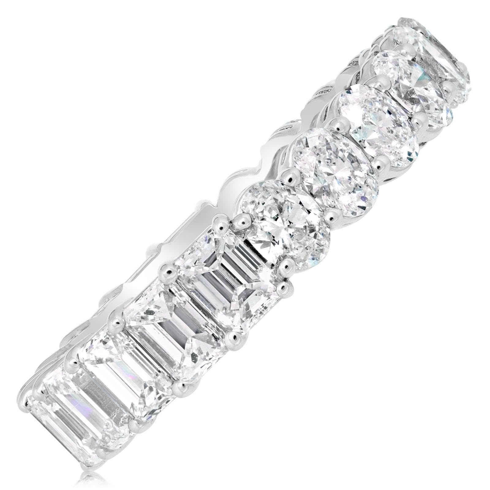 Platinum diamond wedding band from the Reis-Nichols Collection. The band features 11 oval diamonds weighing 1.46 ctw, and 11 emerald cut diamonds weighing 2.06 ctw. Size 6.25 in stock now. Special order sizes available. Pricing may vary with size of ring.