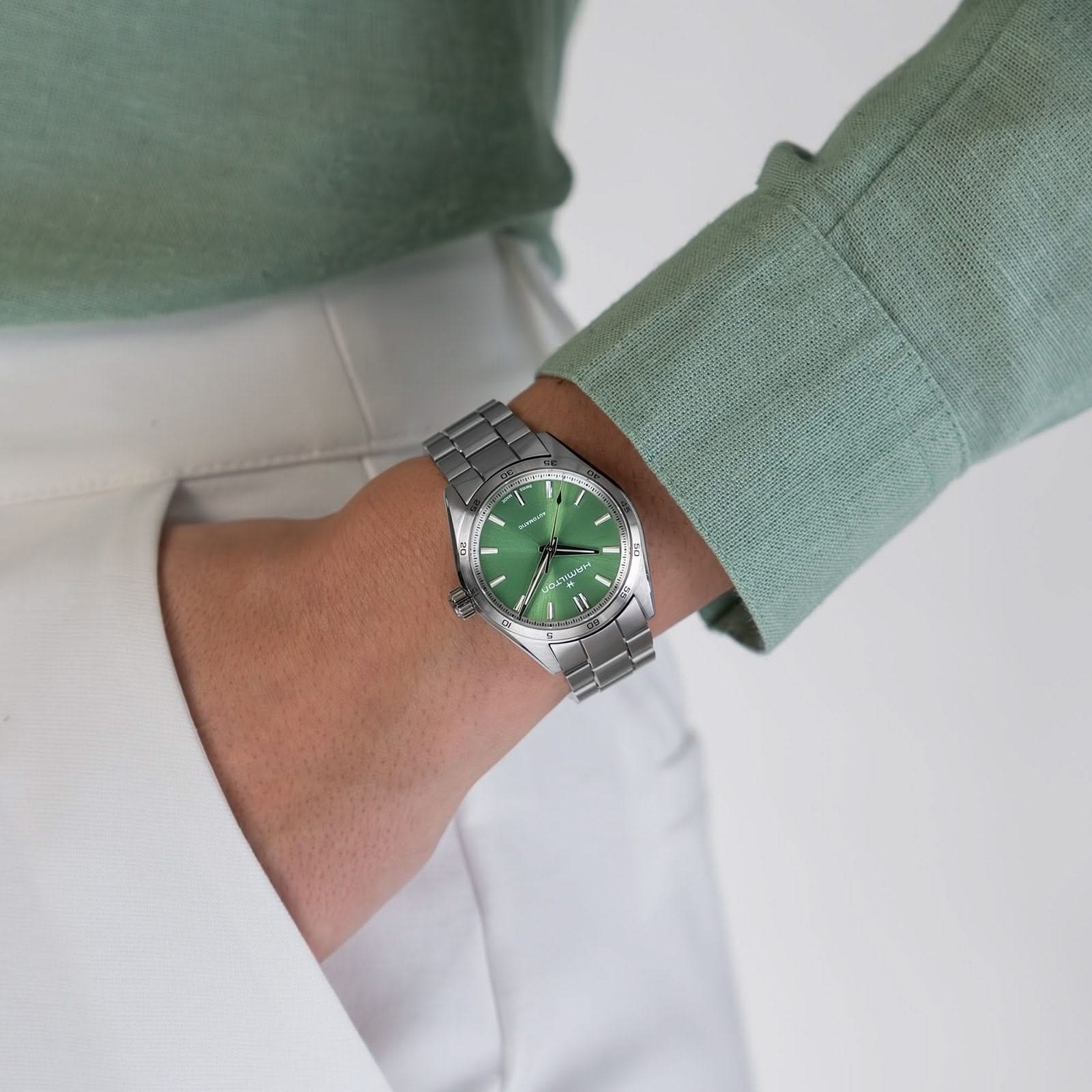 Stainless steel Hamilton Jazzmaster Performer automatic watch featuring a pistachio green index dial with a stainless steel bezel and stainless steel case. The watch case is 34mm and is attached to a stainless steel bracelet.