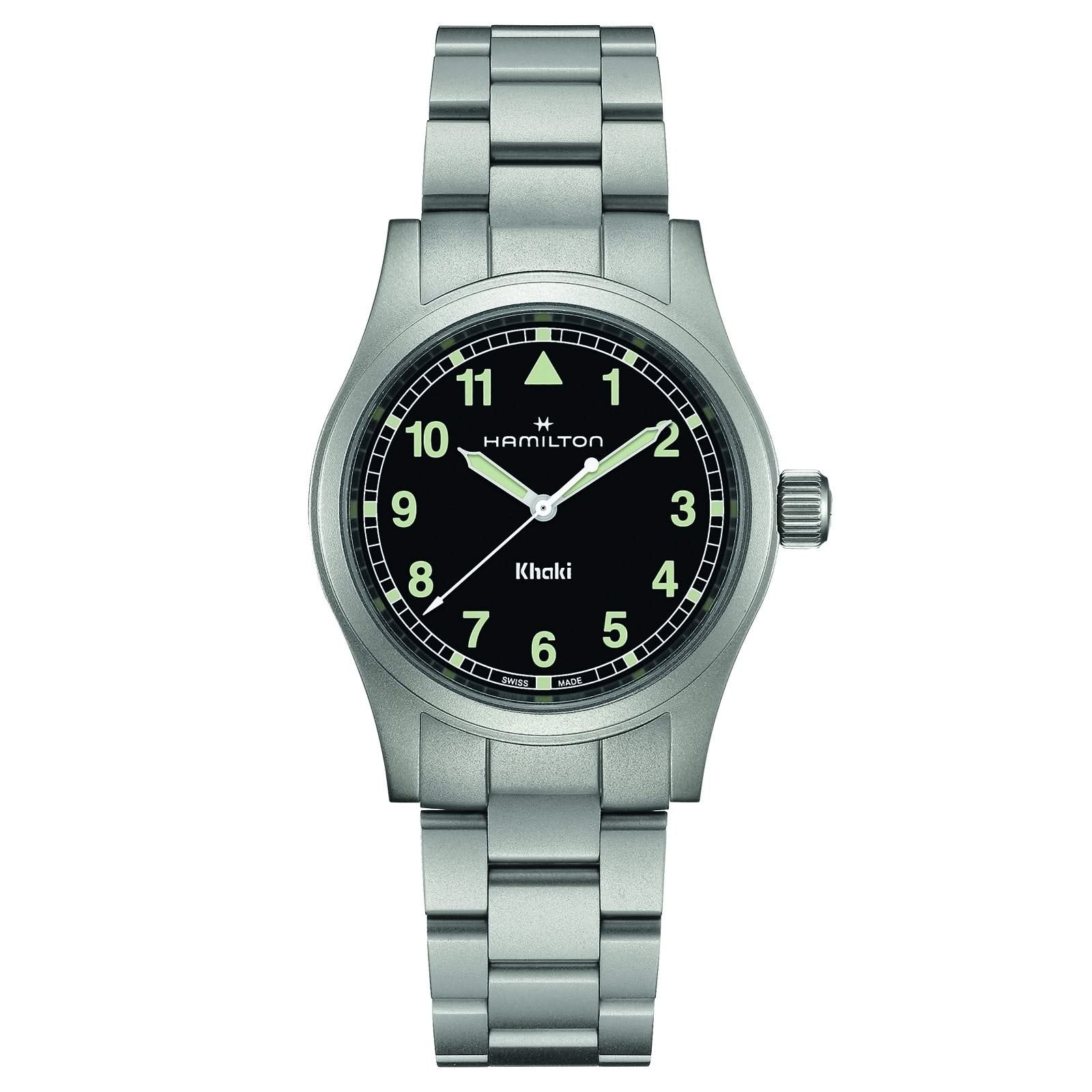 Stainless steel Hamilton Khaki Field quartz watch featuring a black arabic dial with a stainless steel bezel and case. The watch case is 38mm and is attached to a stainless steel bracelet.