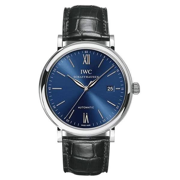 Stainless steel IWC Portofino automatic watch featuring a blue index/Roman date dial with rose gold markers and a high polished bezel and case. The watch case is 40mm and is attached to a black alligator strap.