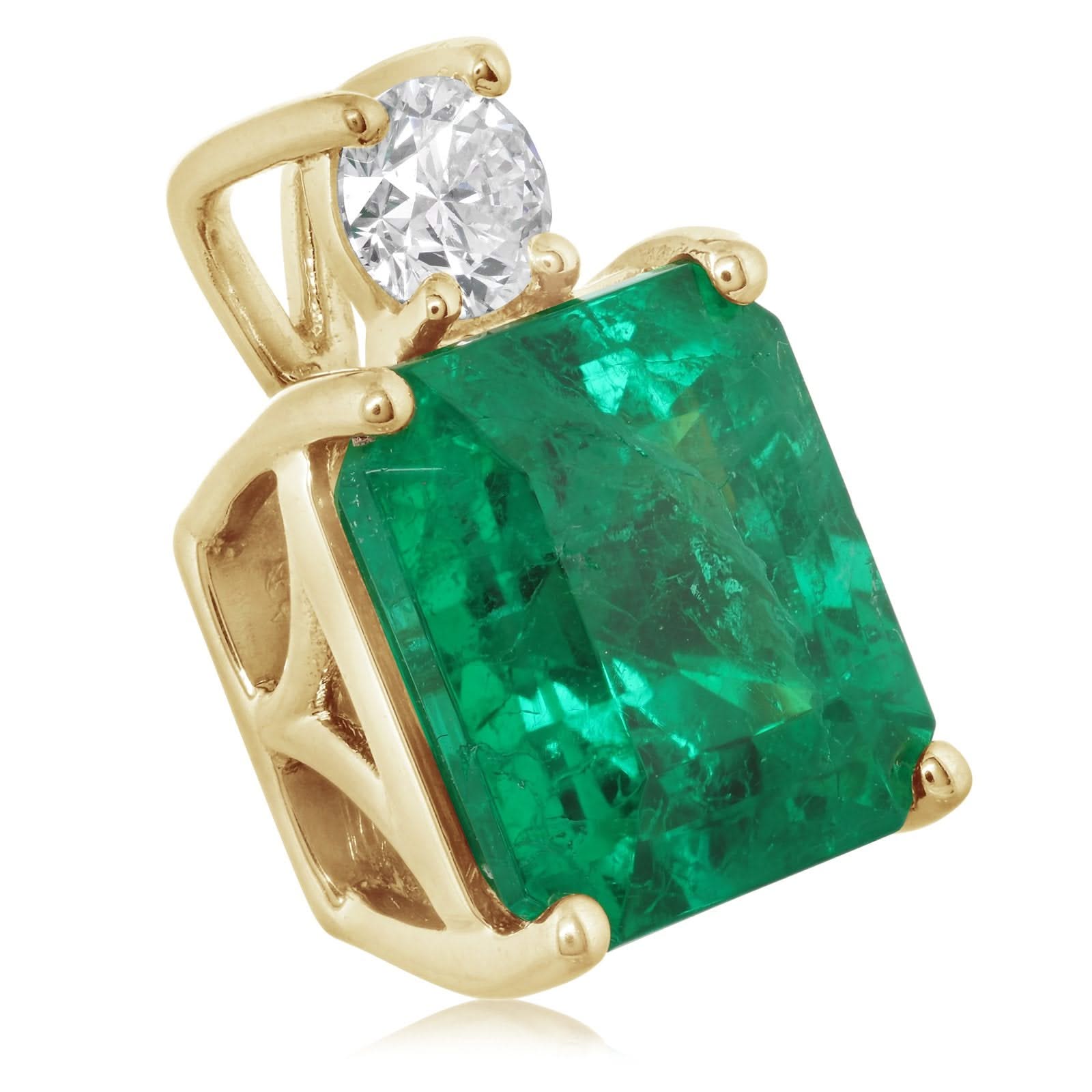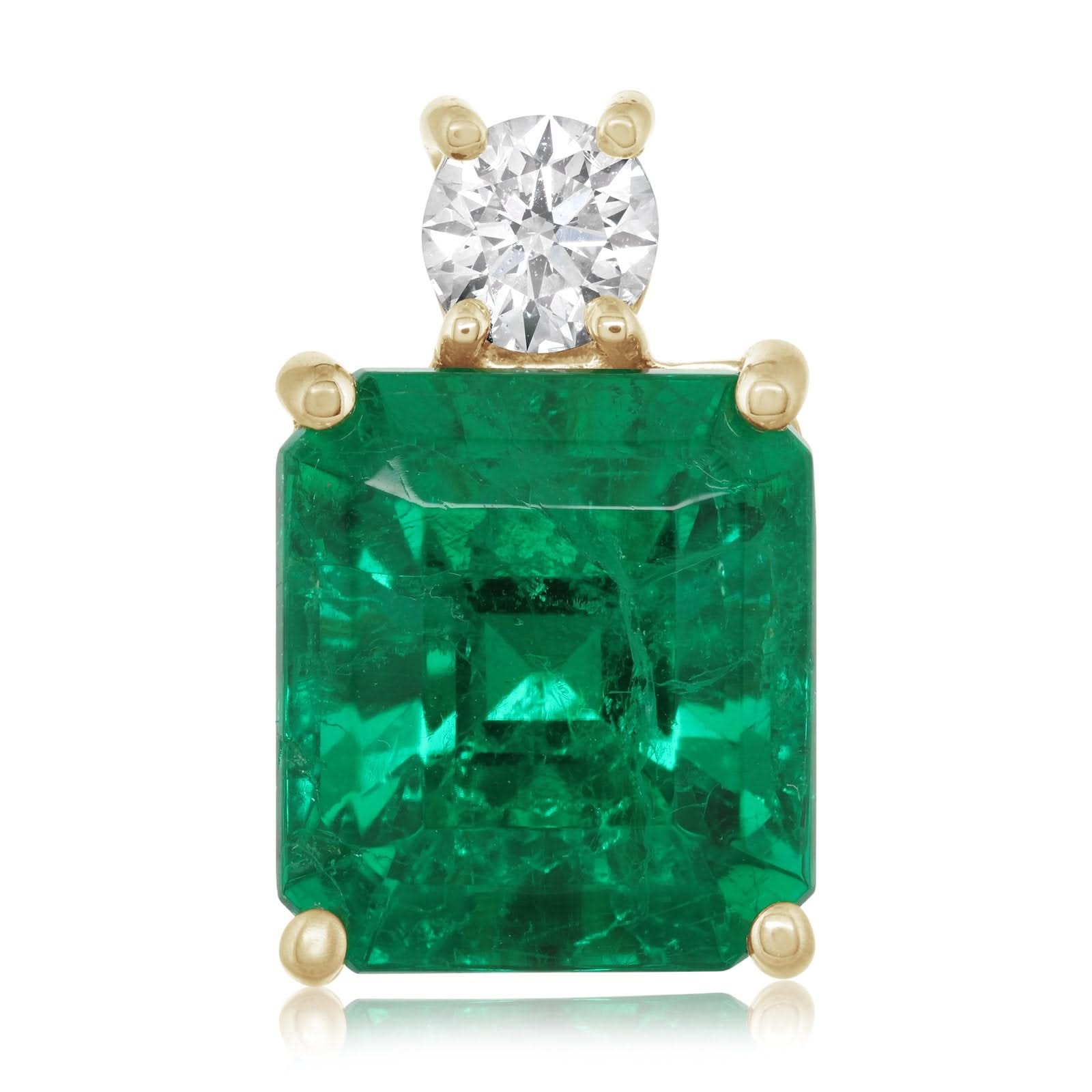 18K yellow gold emerald and diamond pendant featuring one emerald cut emerald weighing 3.25 ct, and one round brilliant cut diamond weighing .21 ct. Chain sold separately. Designed by JB Star.
