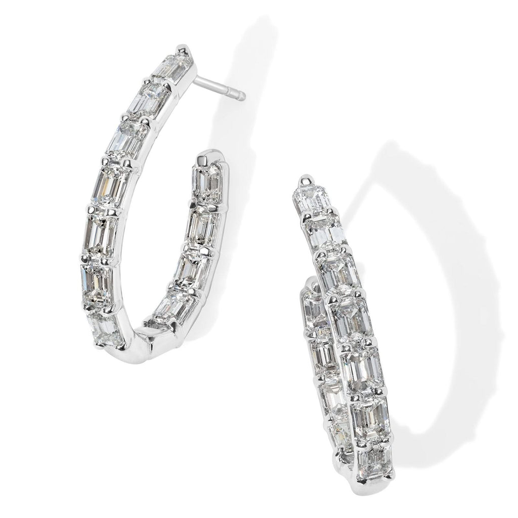 Platinum diamond inside/outside oval hoop earrings. The earrings feature 22 round brilliant cut diamonds weighing 5.30 ctw. Designed by JB Star.