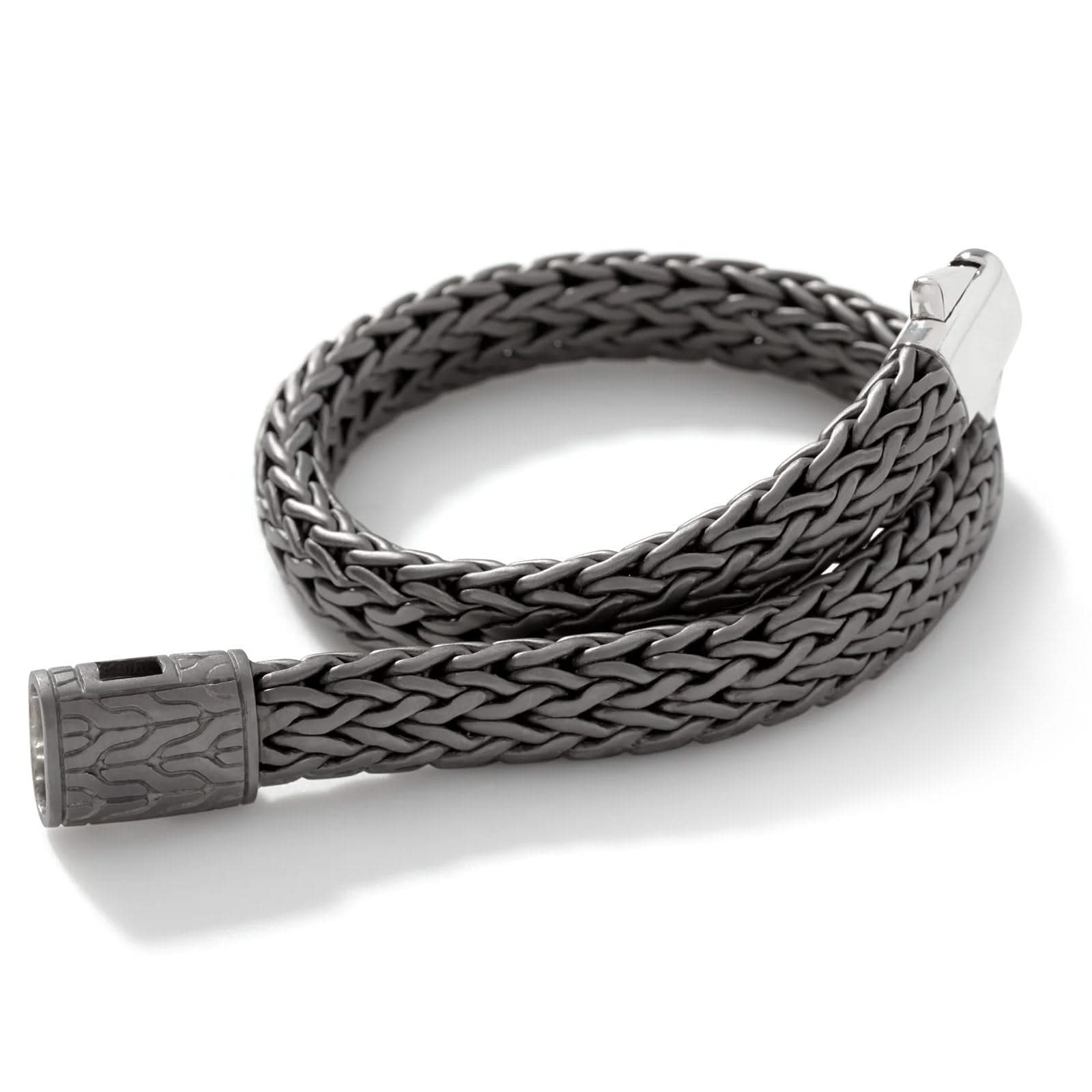 Sterling silver and matte black rhodium Icon flat bracelet. The bracelet measures 7.5mm in width and 8" in length. Designed by John Hardy.
