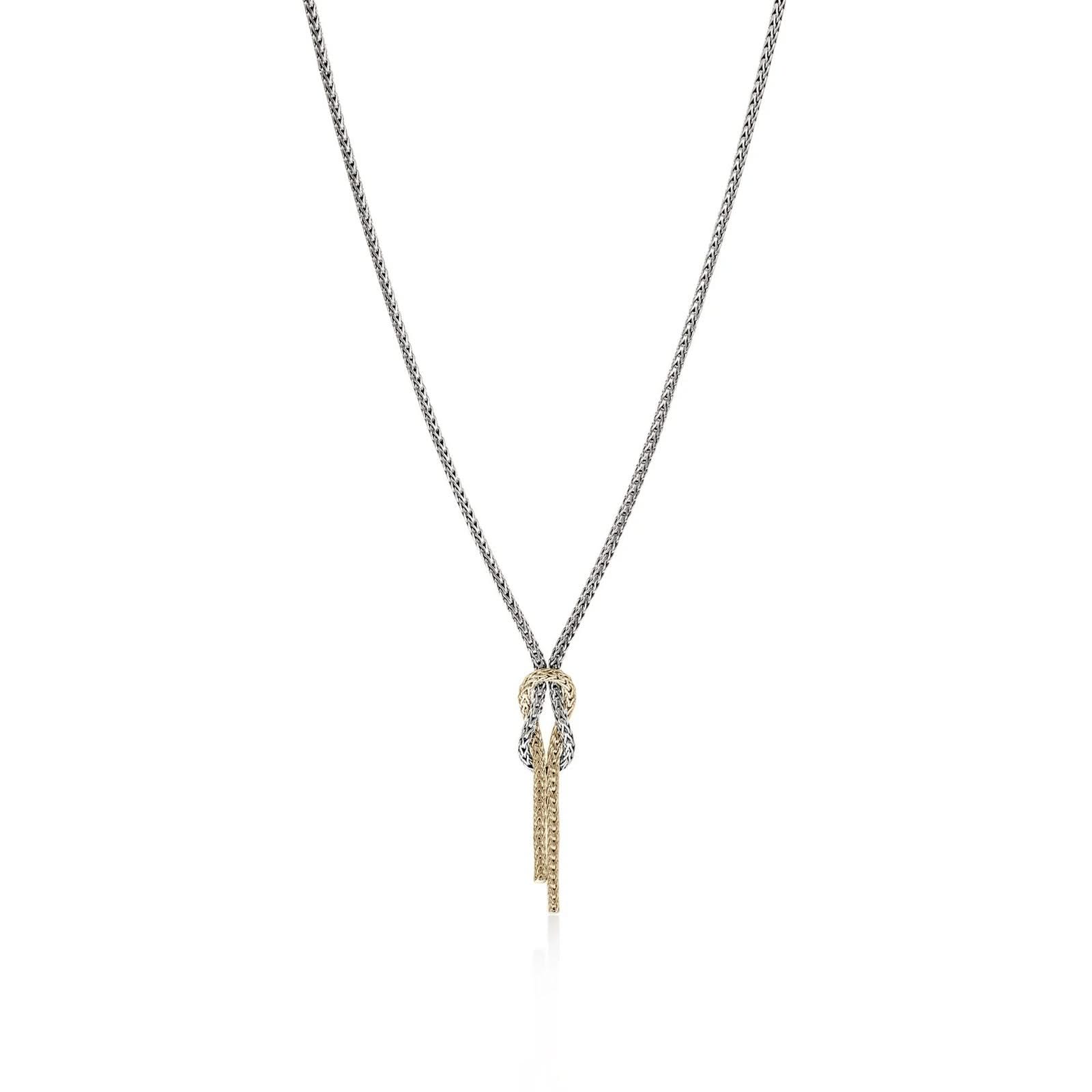 Sterling silver and 14K yellow gold 1.8mm Love Knot lariat chain necklace. The necklace is adjustable from 16-18" in length. Designed by John Hardy.